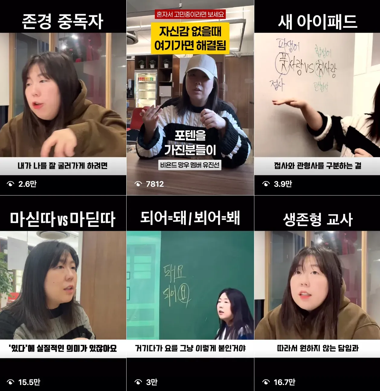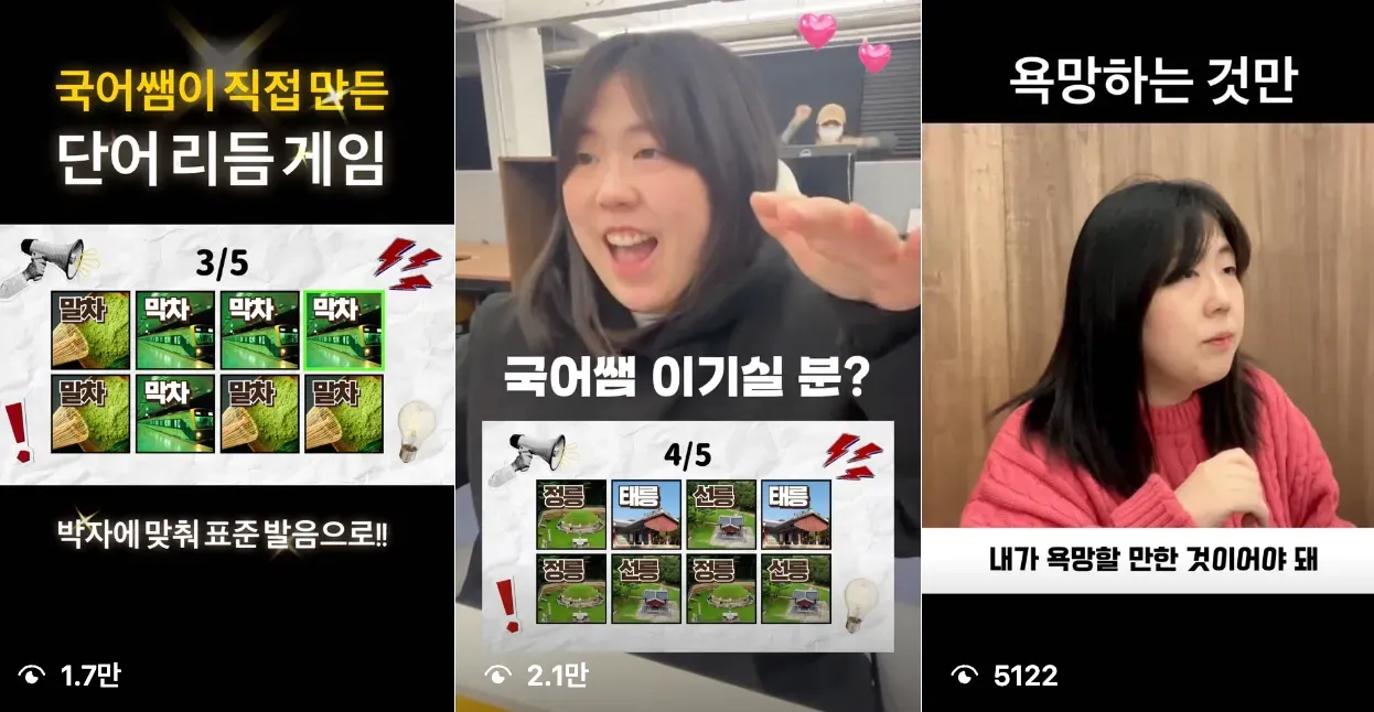 - 또, "국어쌤과 함께하는 단어 리듬 게임"처럼 학습을 놀이로 만들었어요. 사람들은 공부하러 인스타그램에 오지 않습니다. 재미있는 걸 보러 왔다가 "어? 유익하기까지 하네?"라고 느낄 때 팔로우 버튼을 누릅니다.
