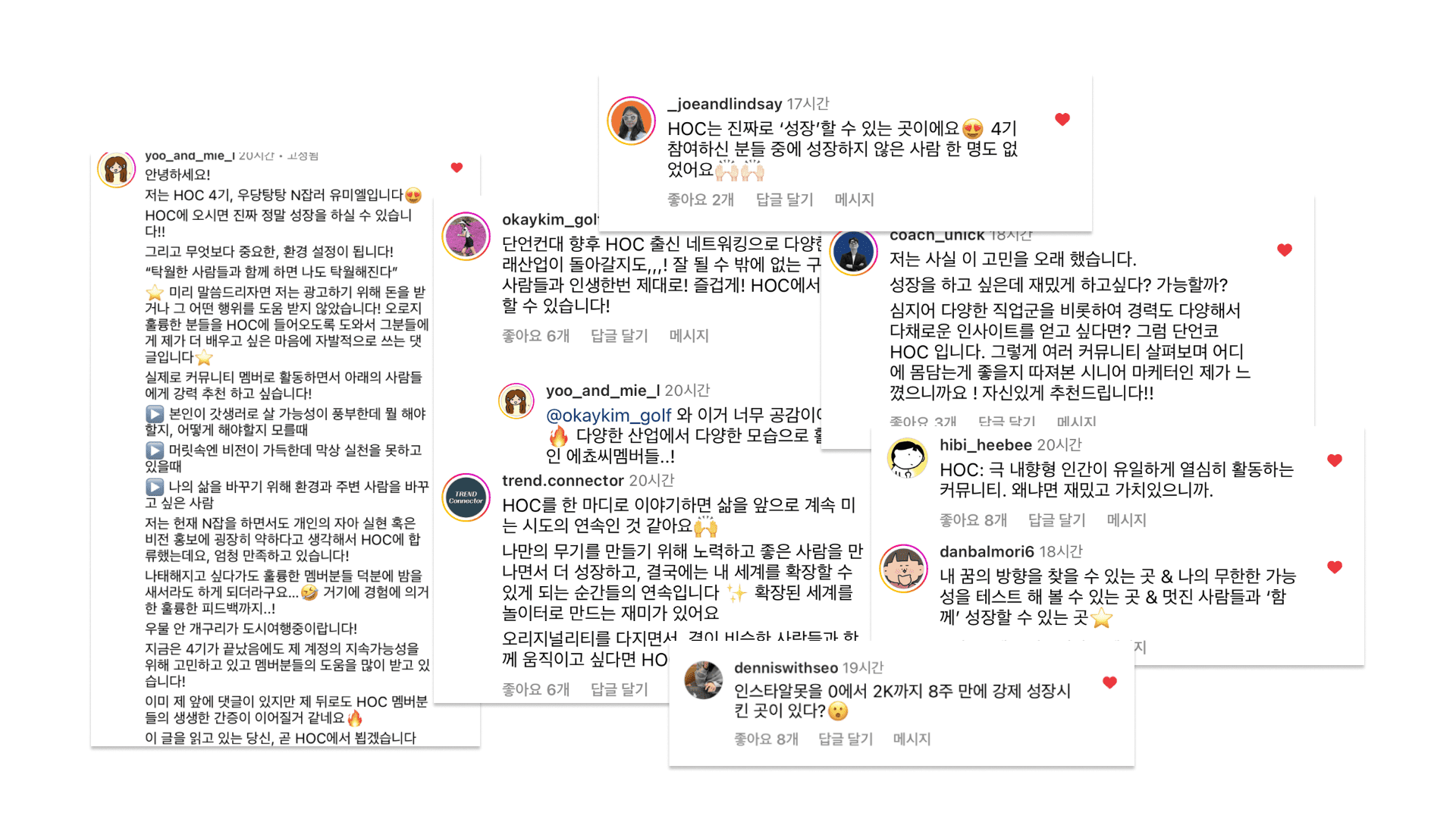 내 가슴 속 불씨를 꽃 피우게 만든 이들을 만났다. 결국에는 해내는 사람들이 모인 곳. HOC 에는 주고 싶어서 안달 난 사람들이 있다. 자기 성장을 진심으로 추구하고, 단순 SNS 프로필 명만 giver가 아닌 진짜 giver들이 모여있다. ‘친목’이 아닌 ‘성장’이 목적이다.