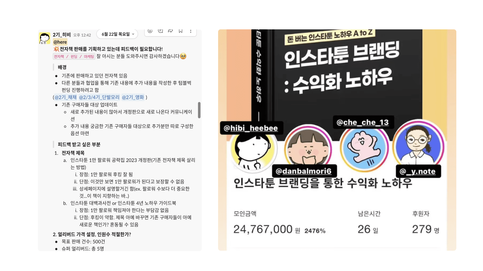 또한, HOC는 멤버들끼리의 협업을 권장하고 있습니다. 함께 시너지가 날 수 있는 부분은 협업해서 또 다른 비즈니스 기회를 창출하는데 돕습니다. HOC 멤버 중 인스타툰 작가들끼리 협업을 하고, 진행 사항을 HOC 멤버들에게 피드백을 요청받아 펀딩에 성공한 사례도 있습니다.