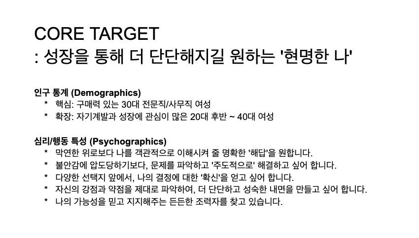 1. 코어 타겟을 상징하는 한 문장: (인구통계, 심리, 니즈가 모두 함축된 캐치프레이즈)