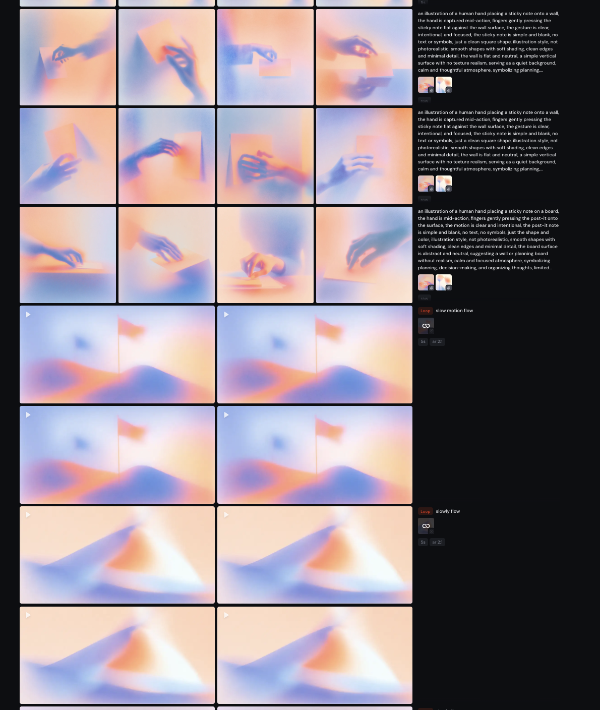 저 같은 경우는 텍스트 기획뿐만 아니라, 미드저니(Midjourney)나 클링(Kling) 같은 이미지/비디오 생성 AI 툴을 활용해서 직접 이미지들을 생성해 무드보드를 만들곤 해요.