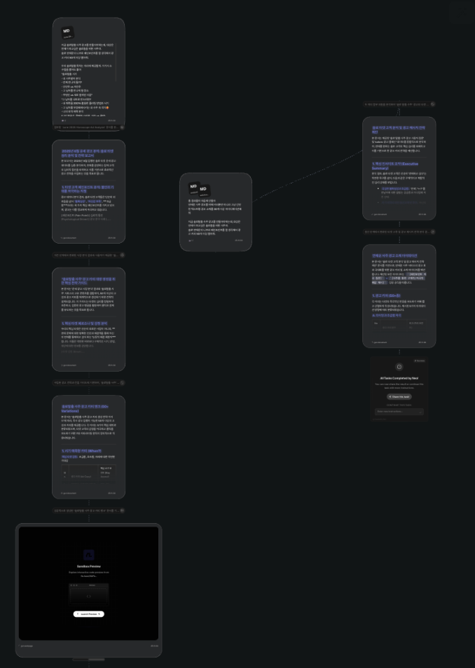 - 노드 구조 기반인게 굉장히 편했어요. 하나의 아이디어를 쭉쭉 발전시키다가도 다시 뒤로 돌아갈 수 있고, 다양한 AI 엔진을 병렬적으로 활용하면서 디벨롭할 수 있다는 점이 굉장히 좋습니다.