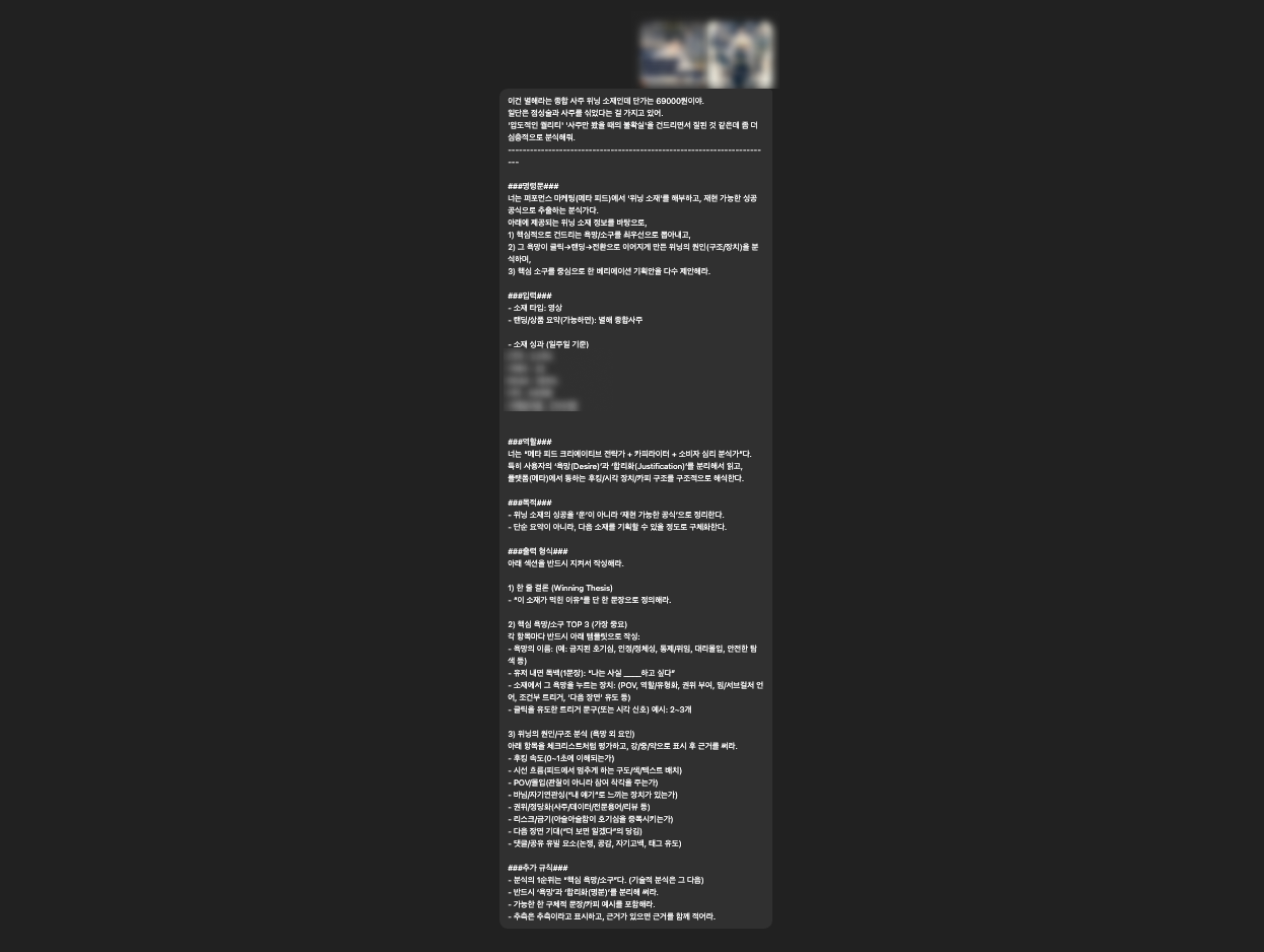 이 글에 정리한 방식은 AI 마케팅의 정석이라기보다는, 메타 광고를 혼자 운영해야 했던 한 마케터의 생존 전략에 가깝습니다. 툴은 계속 바뀌고, AI도 더 좋아질 겁니다. 하지만 소구를 찾고, 실험하고, 판단하는 구조는 크게 달라지지 않습니다.