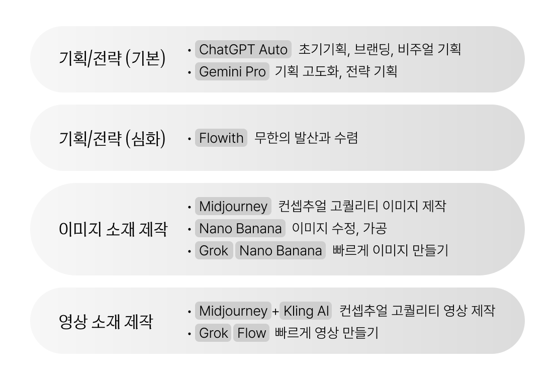 - 어느 단계에서 어떤 AI 툴을 쓰는지 (툴 역할 분담)