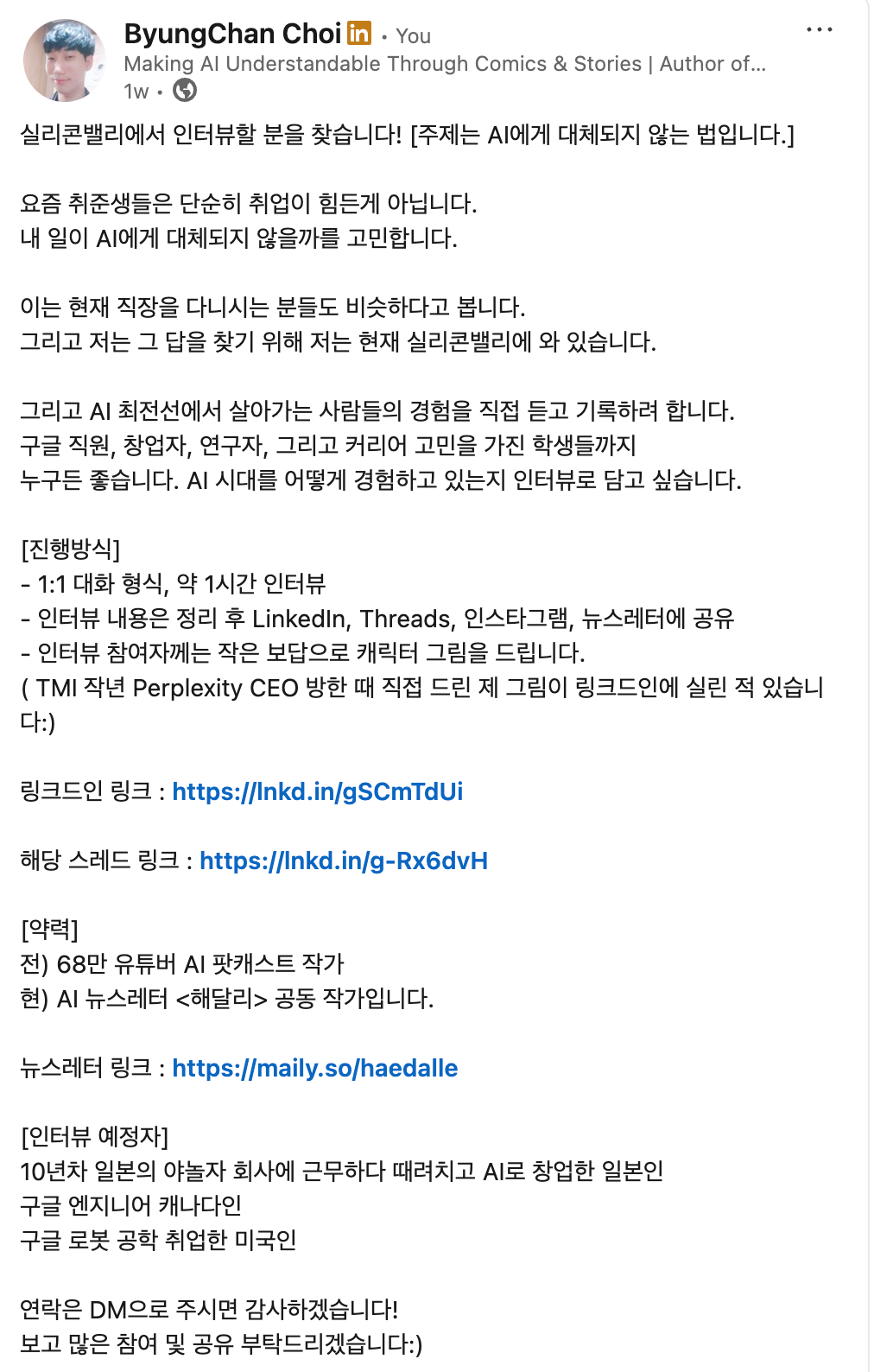 인터뷰를 모집하는 공고를 스레드와 링크드인에 최대한 상세하게 적어서 올렸습니다.