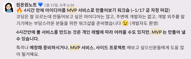 워크숍은 아이린님의 MVP 워크숍 설명 → 각자 MVP 개발 → 만든 서비스 배포 후 발표의 순서로 진행되었습니다.