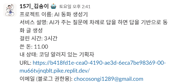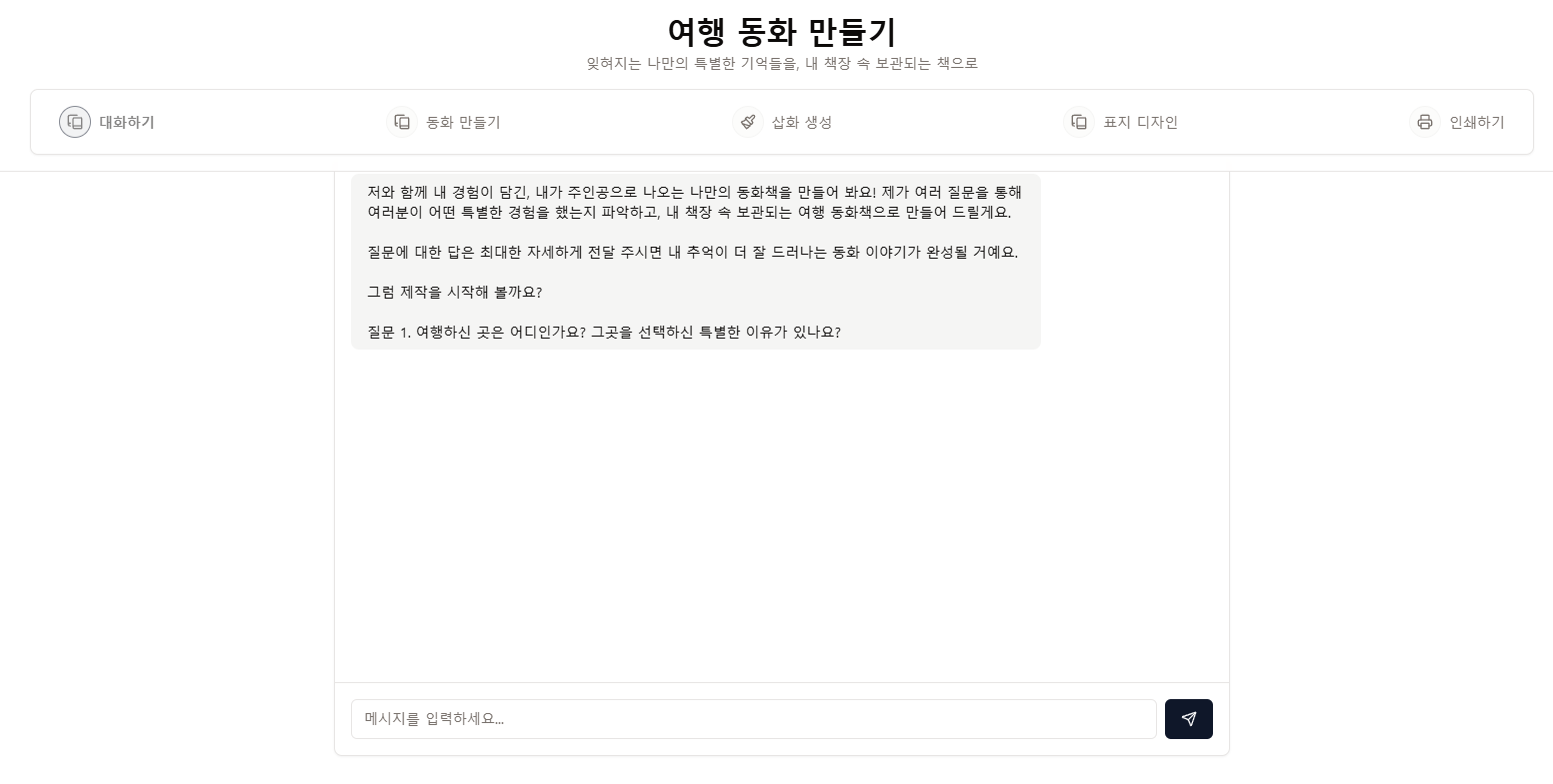 - 'AI의 질문에 답변을 하면 그 답변을 기반으로 동화 글을 생성해 주는 AI 서비스 MVP'를 개발했습니다!!!!!!!!!