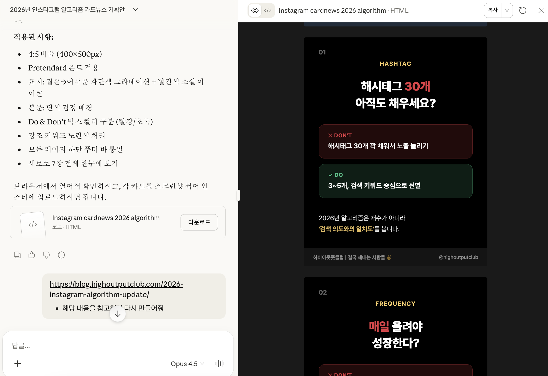 그래서 처음 시도한 방식은 클로드(Claude)에게 블로그 글 전체를 주고 "인사이트 카드뉴스로 만들어줘"라고 하는 거였습니다.