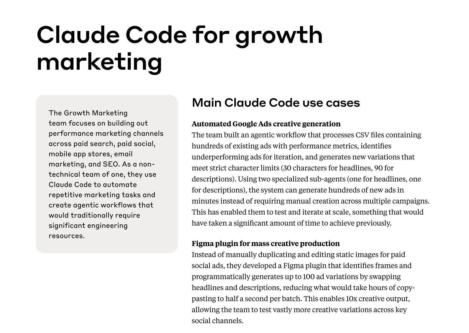Google Ads 광고 카피를 수동으로 작성하고, 성과를 확인하고, 다시 고치는 반복 작업. 이 팀이 한 건 CSV 파일을 Claude Code에 넣어서 성과가 낮은 광고를 자동으로 식별하고, 새로운 카피 변형을 생성하는 시스템을 만든 거였어요.