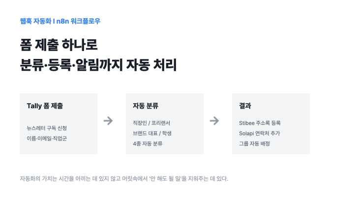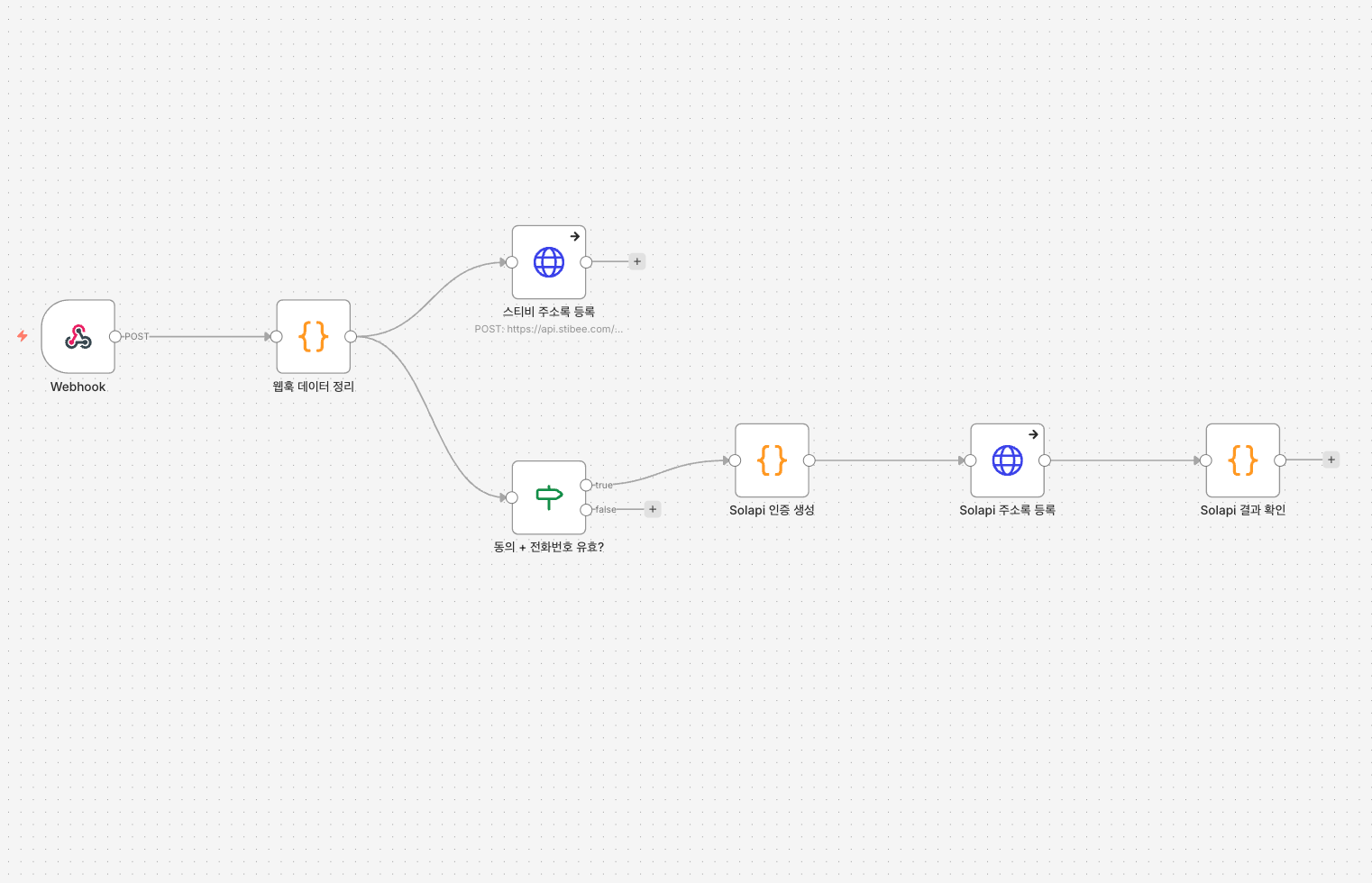 클로드에게 "Tally 폼이 제출되면 스티비 주소록 등록, Solapi 연락처 추가, 직업군 분류까지 한 번에 되게 만들고 싶다"고 설명하면서 n8n 워크플로우를 설계했습니다.