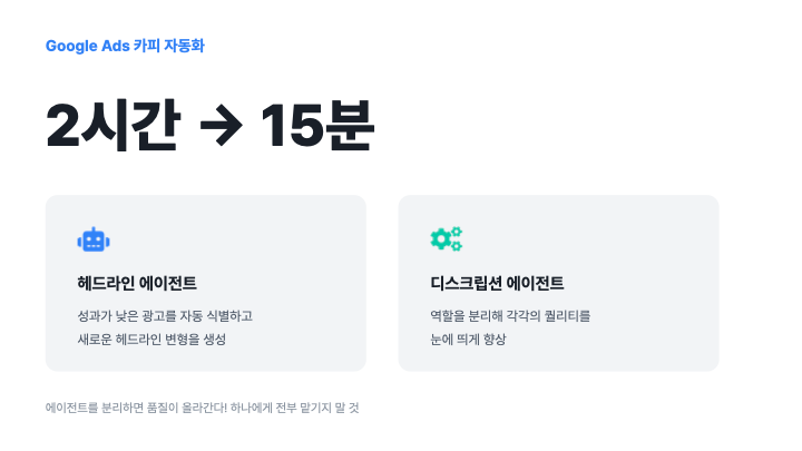 헤드라인을 쓰는 에이전트와 디스크립션을 쓰는 에이전트를 따로 뒀거든요. 하나의 에이전트한테 전부 맡기면 품질이 들쭉날쭉해지는데, 역할을 나누니까 각각의 퀄리티가 눈에 띄게 올라갔다는 겁니다.
