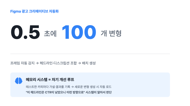 테스트한 광고 카피마다 가설과 결과를 기록해두고, 새로운 변형을 생성할 때 그 데이터가 자동으로 로드되는 구조예요. "이 헤드라인은 CTR이 낮았으니 이런 방향으로 바꿔보자"를 시스템이 알아서 판단하는 거죠.