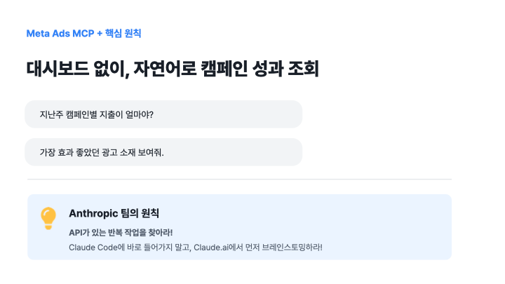 이건 Claude Desktop에서 바로 광고 캠페인 성과를 조회할 수 있게 만든 도구입니다. 마케터가 Meta 대시보드를 열고, 필터 걸고, 데이터 내려받고, 정리하는 과정을 거칠 필요 없이 자연어로 물어보면 됩니다.