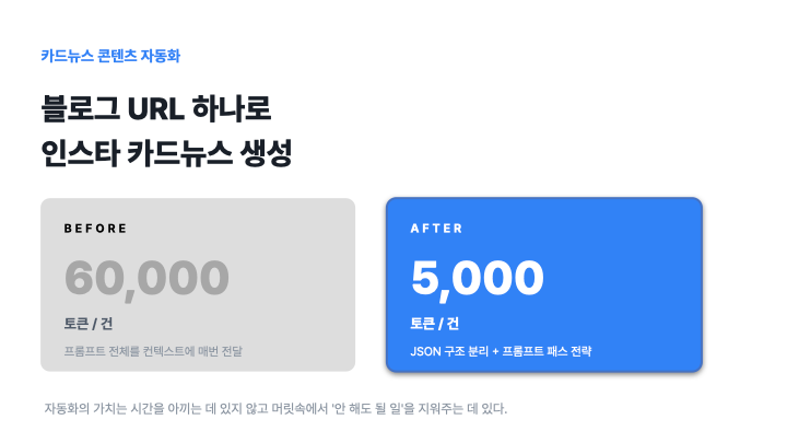매번 프롬프트 전체를 컨텍스트에 넣다 보니 한 번에 약 60,000토큰이 소모됐어요. 토큰은 곧 비용이고, 곧 속도이기도 하거든요.