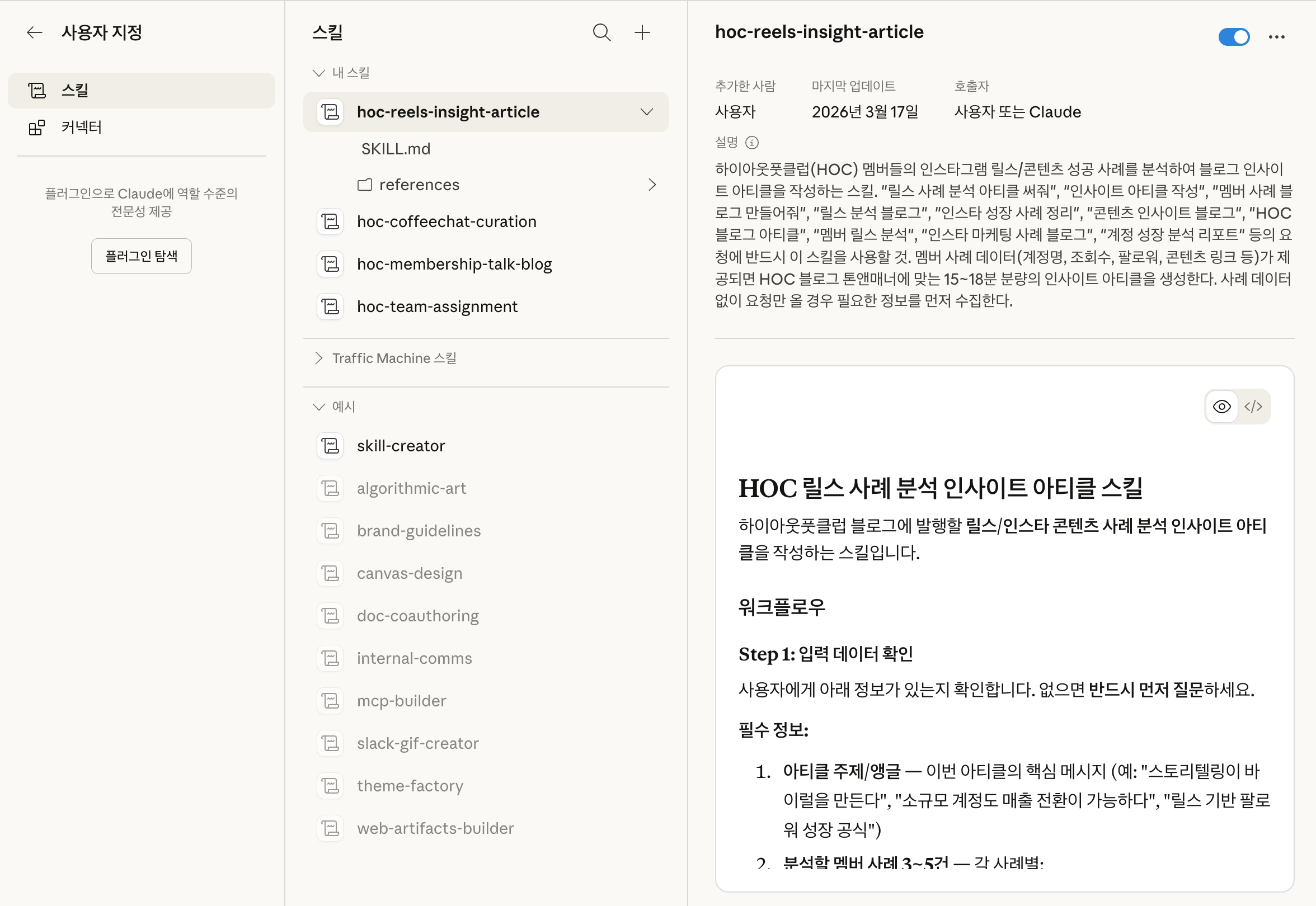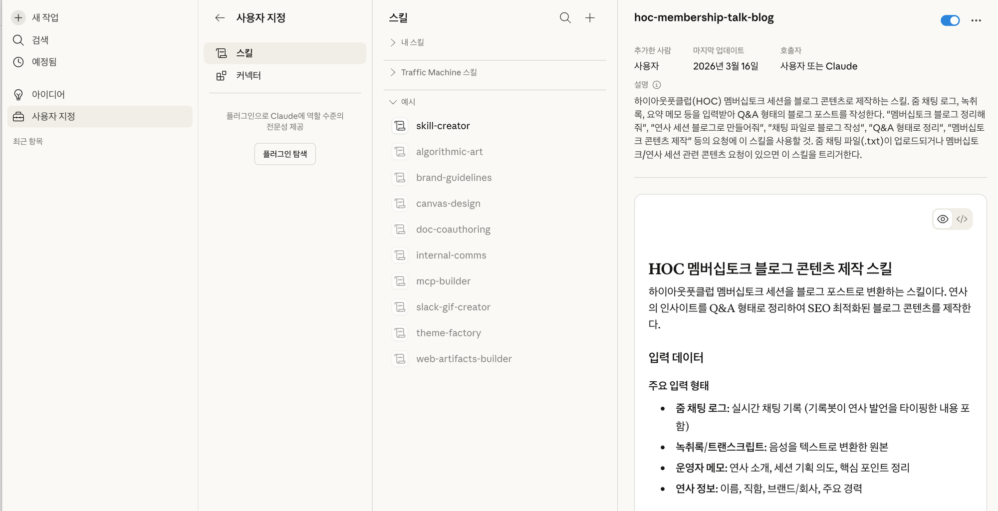 - 예를 들어 브랜드 가이드 클로드 스킬과 블로그 작성 클로드 스킬이 동시에 활성화될 수 있습니다.
