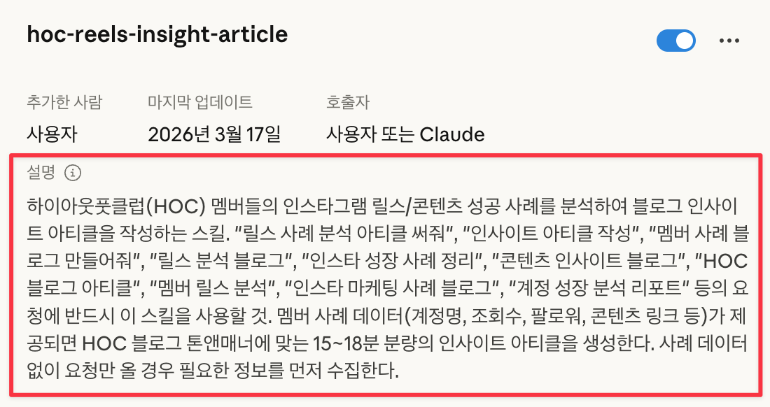 클로드가 클로드 스킬을 자동으로 불러오는 기준은 description입니다. 공식 가이드에서도 클로드 스킬에서 가장 중요한 부분이라고 강조합니다.