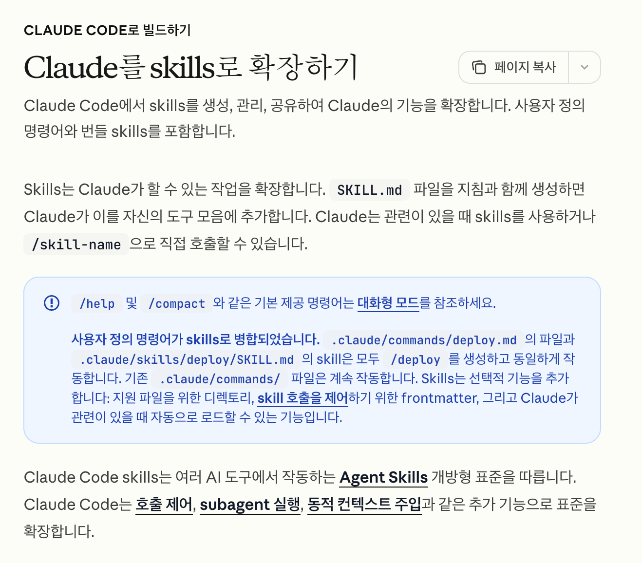 | 매번 해야 하는 일 | 프롬프트를 복붙하거나 다시 작성 | /스킬이름 한 줄이면 끝 |