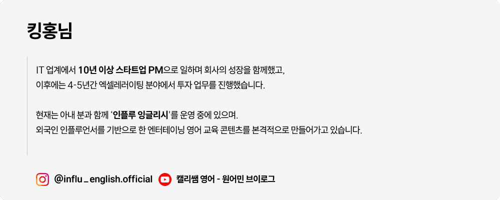 지난 8월, 1만 팔로워를 달성했던 한 채널이 불과 3개월 만에 2.6만 팔로워로 폭발적인 성장을 이뤄냈습니다. 바로 킹홍님이 운영하는 '인플루 잉글리시' 채널인데요.