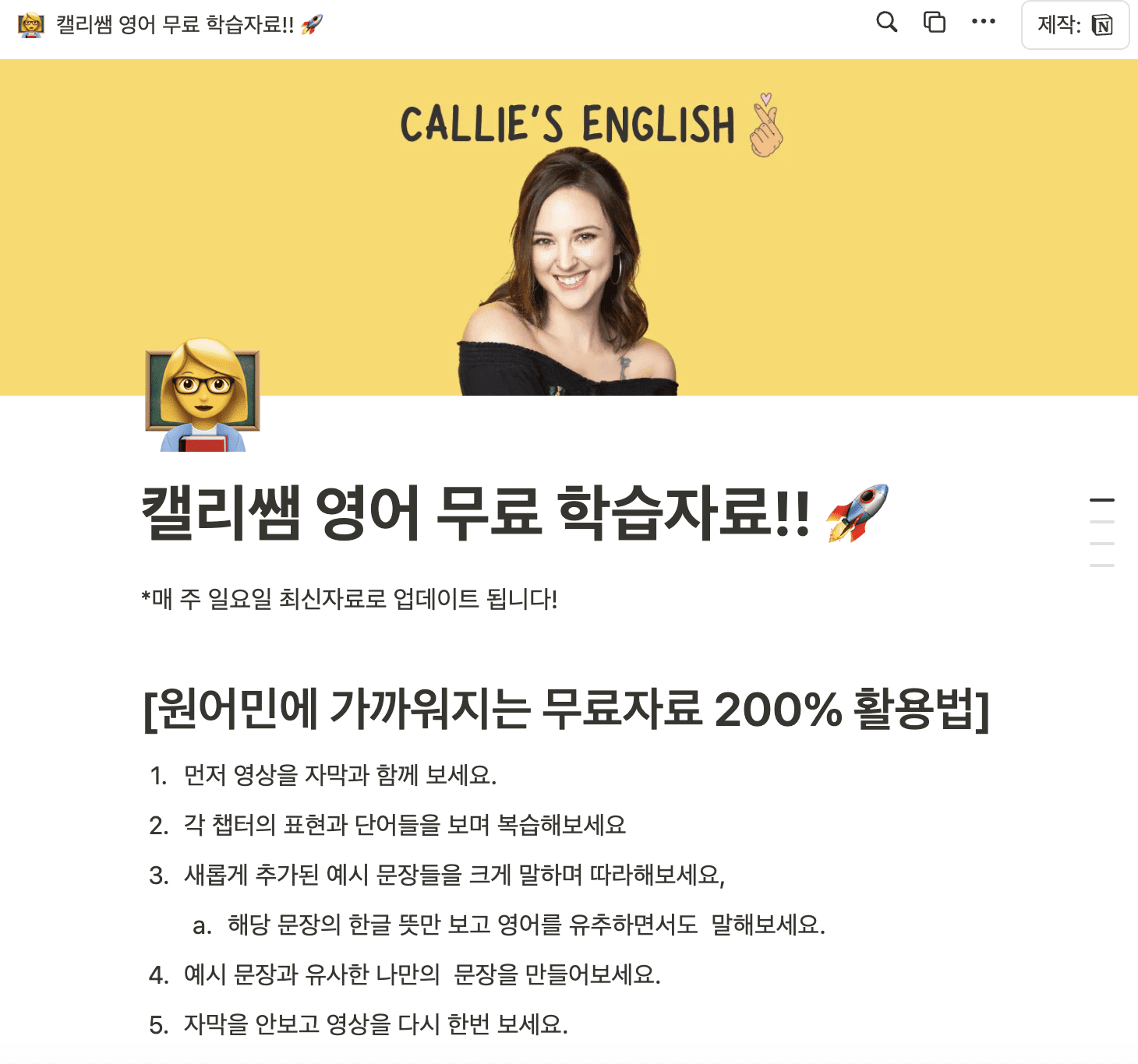 - 스크립트, 영어 표현, 예문과 같은 자료를 노션에 정리.