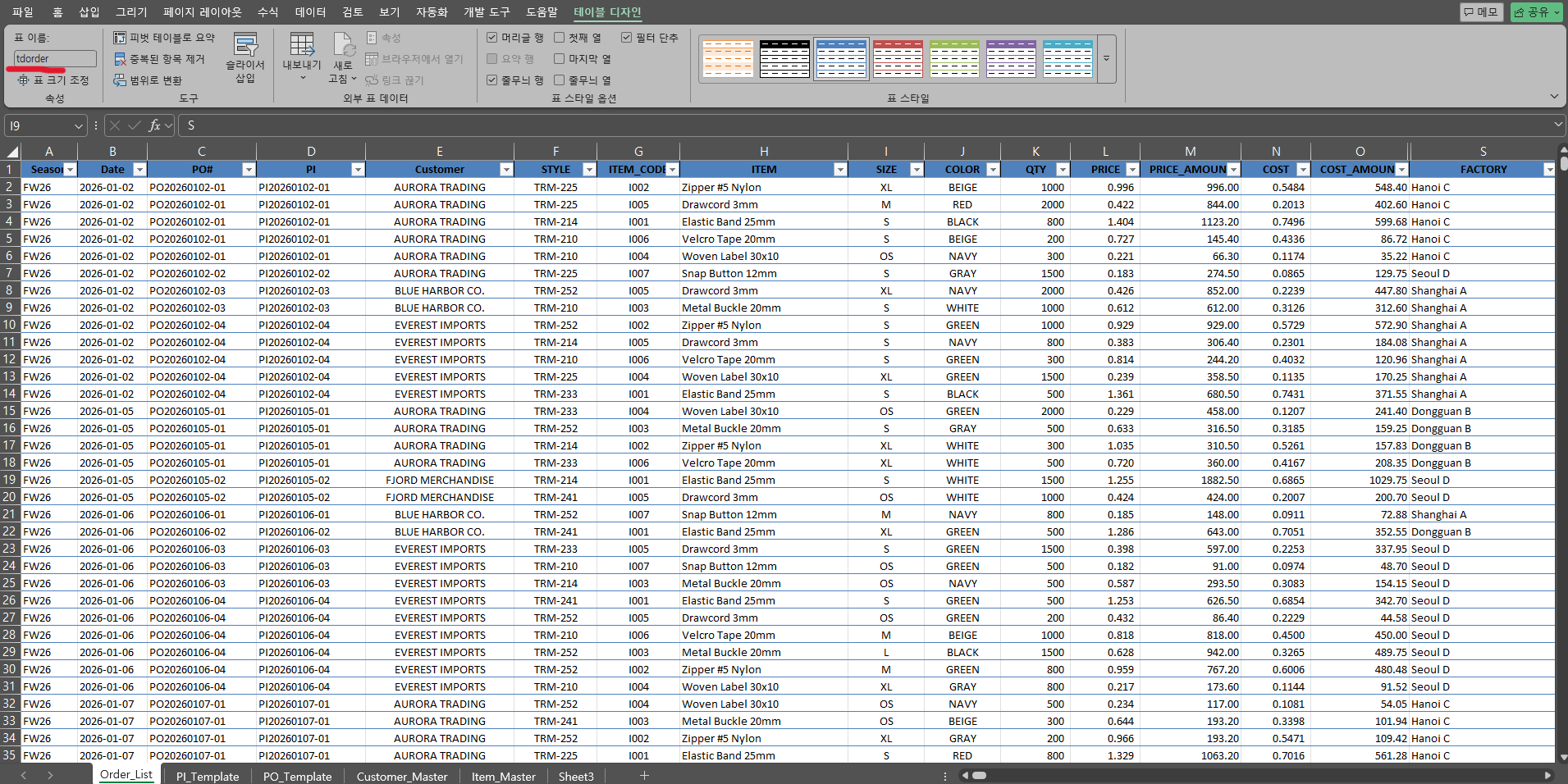 - Season | Date | PO | PI | Customer | STYLE | ITEM_CODE | ITEM | SIZE | COLOR | QTY | PRICE | PRICE_AMOUNT | COST | COST_AMOUNT | FACTORY