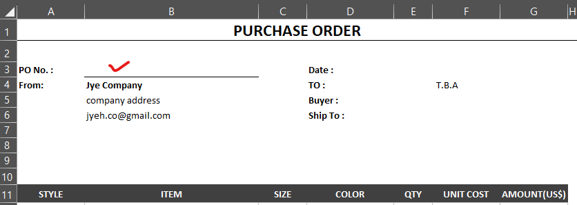 1) PO_template에서 PO 번호를 입력할 셀을 정한다.(B3)