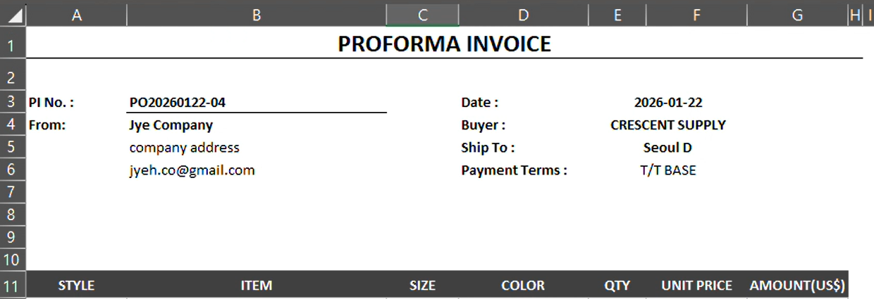 대신 PI에는 UNIT COST 대신 UNIT PRICE 단가로 (PRICE 열이고 L열) 넣으면 된다.