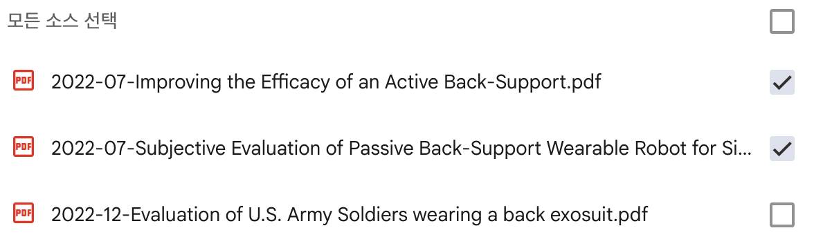 리포트와 PPT 등 여러 파일을 소스로 올렸지만 모든 답변에 모든 자료를 볼 필요는 없다. 시장 동향을 물어볼 때는 보고서 파일만, 슬라이드 구성 아이디어를 얻을 때는 기존 IR 자료만 선택해서 질문했다.