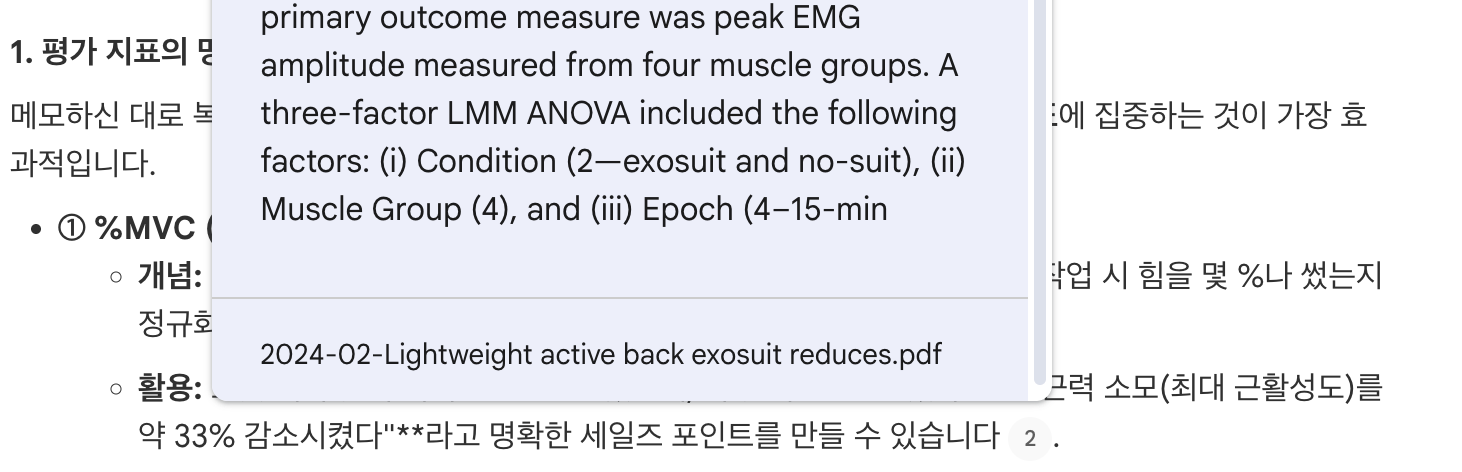 NotebookLM이 생성한 답변에 이 소스가 활용된 경우 몇 번째 자료를 활용했는지 인용이 달리게 된다. 인용을 클릭하면 원본 문서의 어느 부분에서 가져온 내용인지 즉시 확인할 수 있다.
