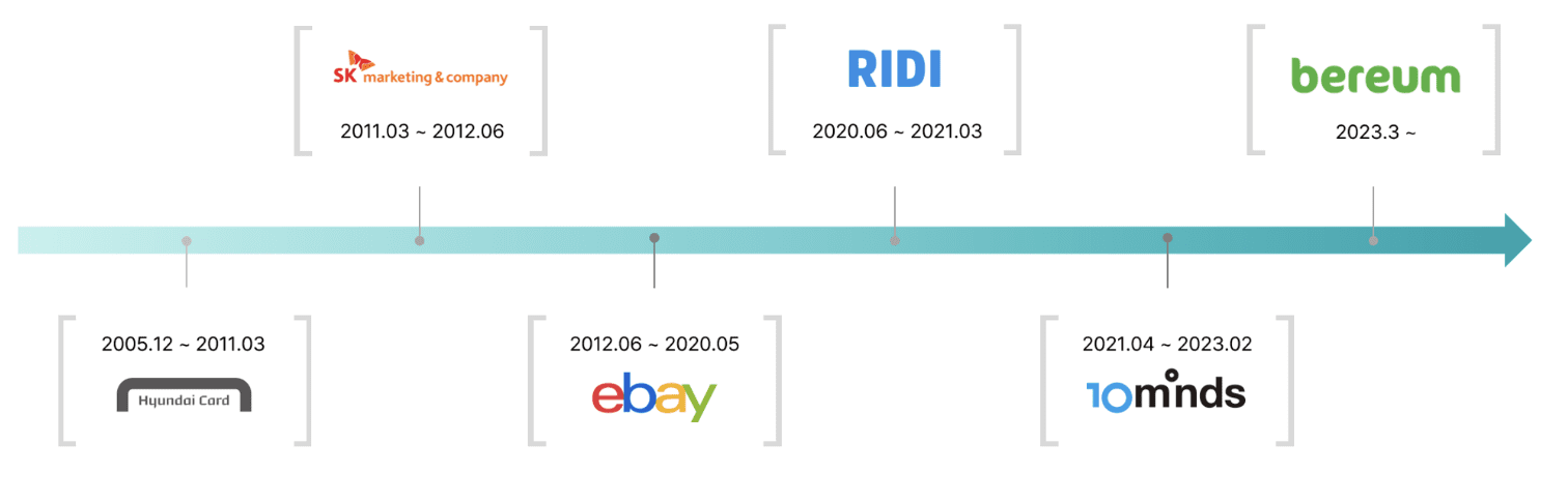 19년차 유승우 마케터님은 마케팅 경력을 현대카드, SK, 그리고 이베이와 같은 대기업과 외국계 회사에서 시작하셨습니다. 이곳에서 프로모션 기획부터 브랜드 마케팅, 고객 관계 관리(CRM)까지 다양한 직무를 맡으며 기본기를 쌓았죠. 큰 조직에서 겪은 다양한 경험은 그가 마케팅의 여러 영역을 다루는 데 있어 큰 밑거름이 되었습니다.