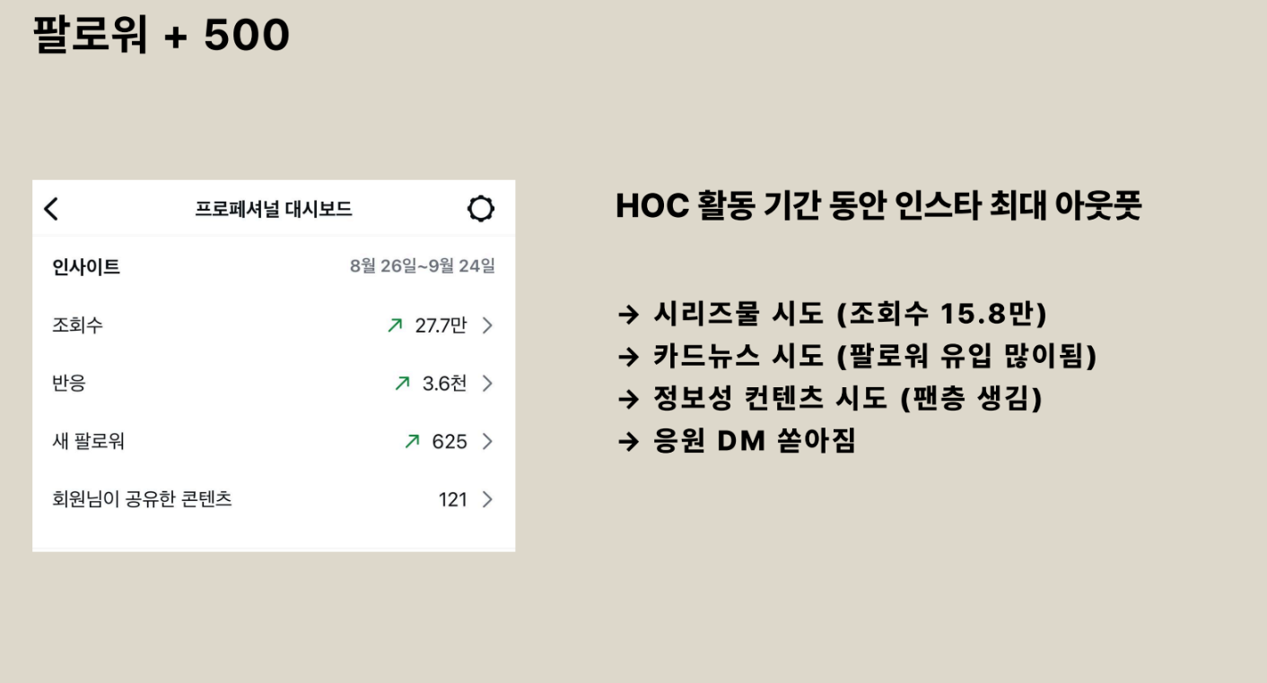 그리고, 어떻게 지나간지도 모르는 새에 한 달의 기수 프로그램은 끝났고, 결과적으로 나는 인스타그램을 운영한 이레로 최대 아웃풋을 냈다. 처음 설정했던 목표 (블로그를 통한 신규 클라이언트 유입과 팔로워 +500)도 초과 달성했다.