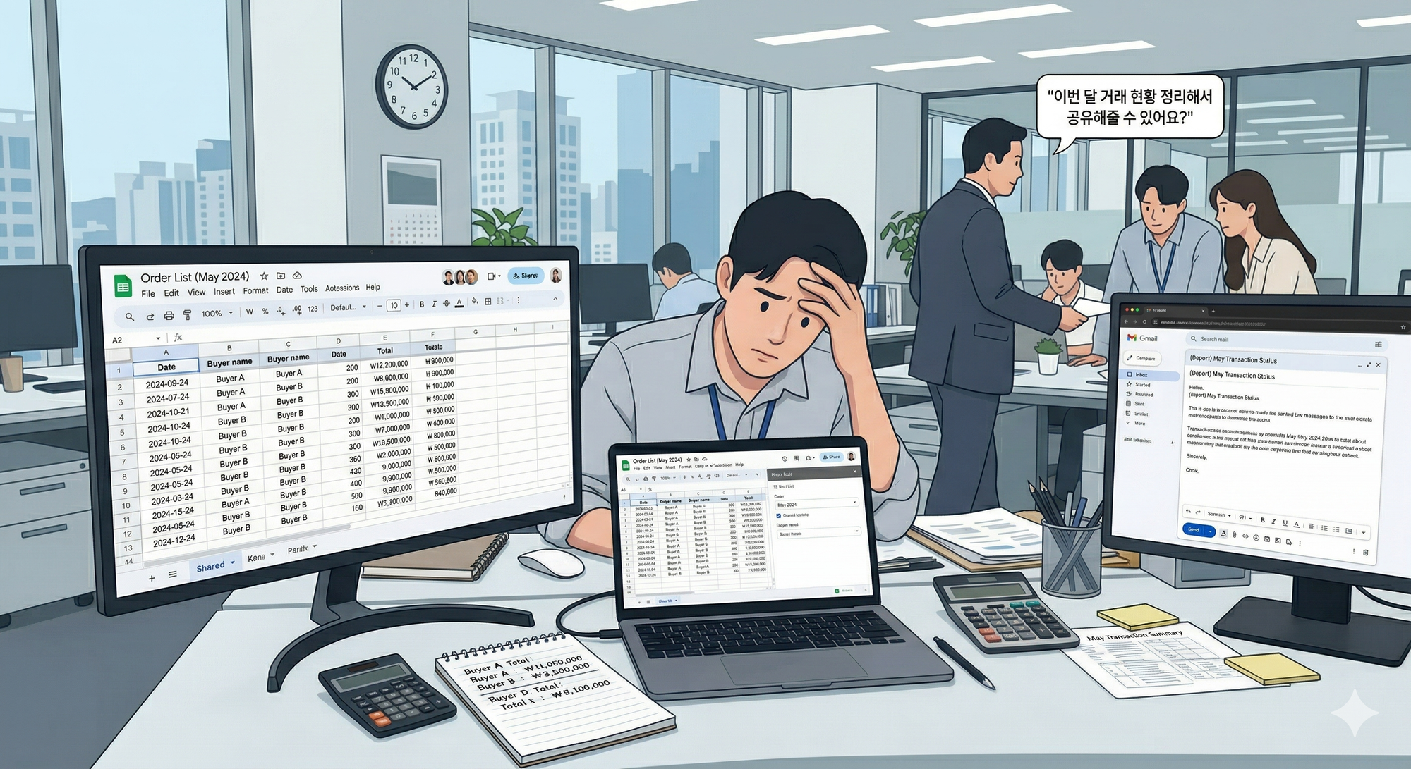 Order List에 데이터는 다 있었지만 나는 그걸 또 열어서 월 기준으로 필터 걸고, 바이어 별로 합계 내고, 복사해서, 메일을 썼다. 한 두시간이 걸렸다.
