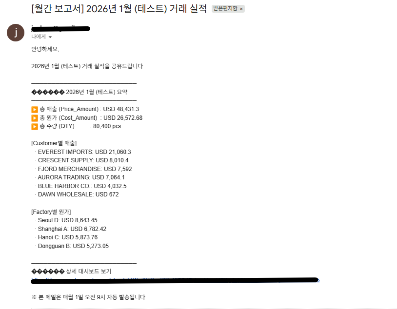 → DASHBOARD 시트 링크 + 요약 내용을 이메일 본문에 담아