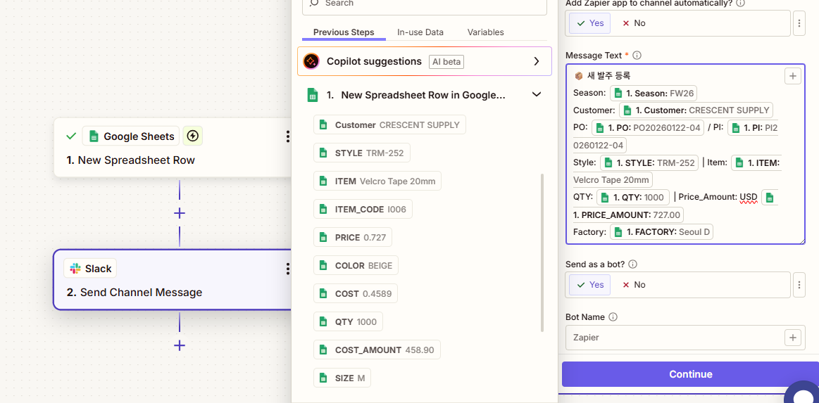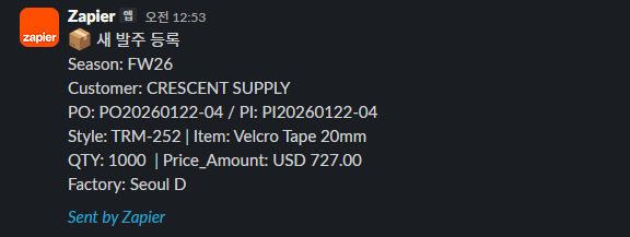 Order_List에 새 거래 데이터가 추가되는 순간, 슬랙 팀 채널에 자동으로 알림이 간다.