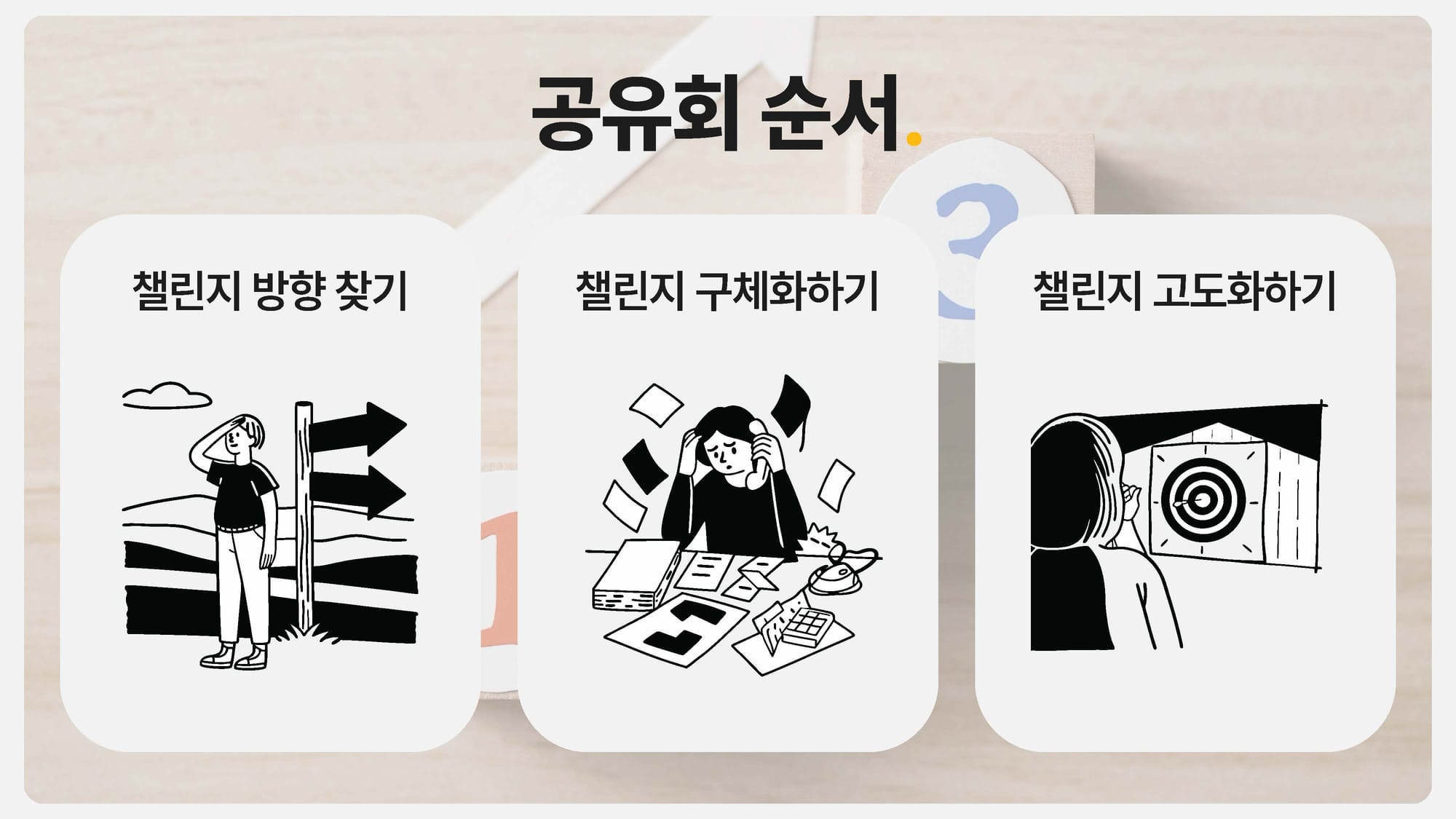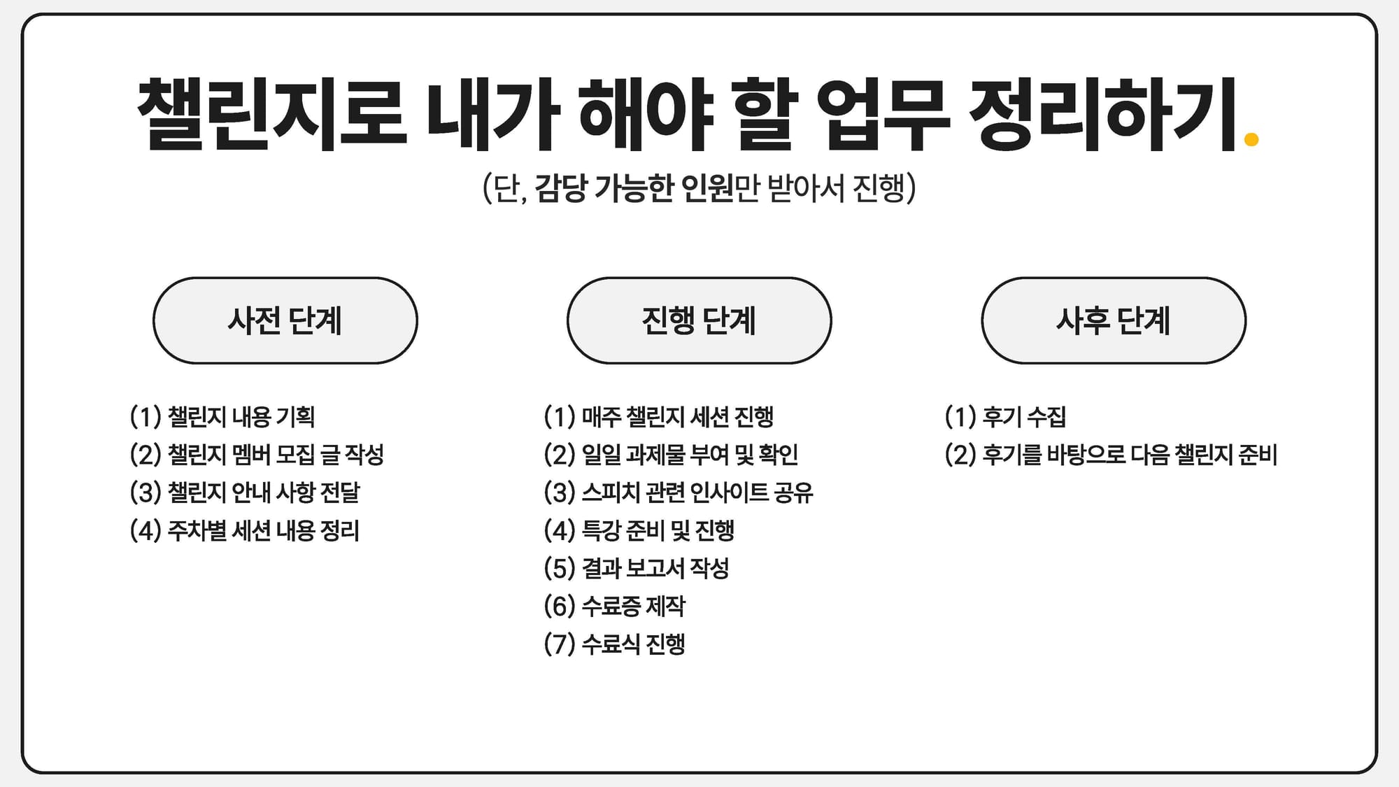 챌린지를 운영하는 건 단순히 특정 세션 진행에서 그치지 않습니다. 한 사람, 한 사람의 성장을 돕기 위해서는 일련의 과정이 필요한데요, 김형님은 챌린지 전, 챌린지 중, 챌린지 후에 어떤 것들을 해야 하는지 먼저 정리했어요.