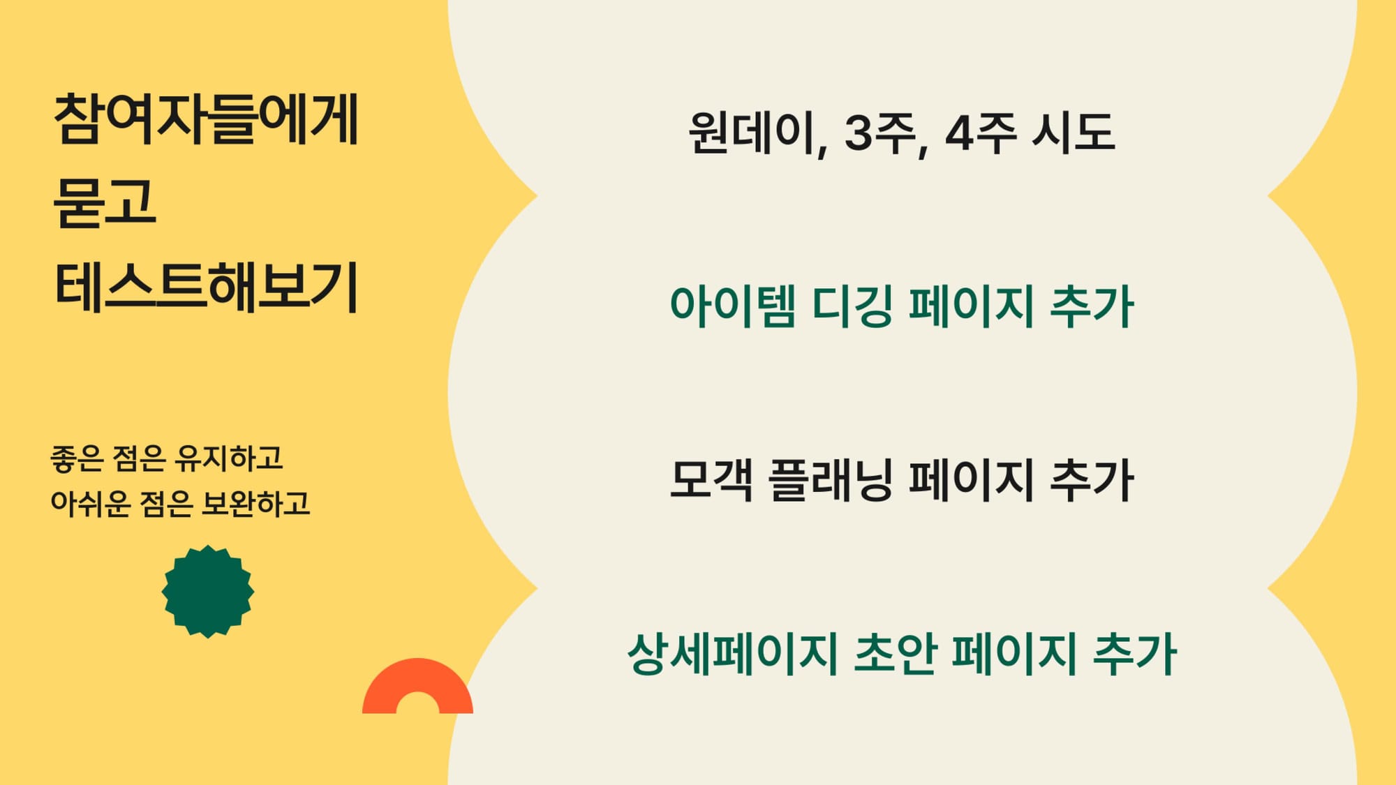 - 실험실 테스트: 4주 챌린지 진행 전 단시간 프로그램으로 해본 뒤 피드백과 챌린지 참여 여부를 받아본다