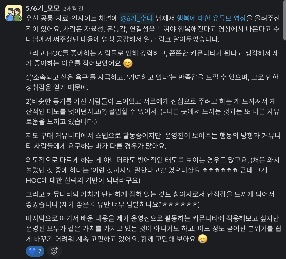 2)비슷한 동기를 가진 사람들이 모여있고 서로에게 진심으로 주려고 하는 게 느껴져서 계산적인 태도를 벗어던지고(?) 몰입할 수 있어서. (=다른 곳에서 느끼는 것과는 또 다른 자유로움을 느끼고 있습니다.)