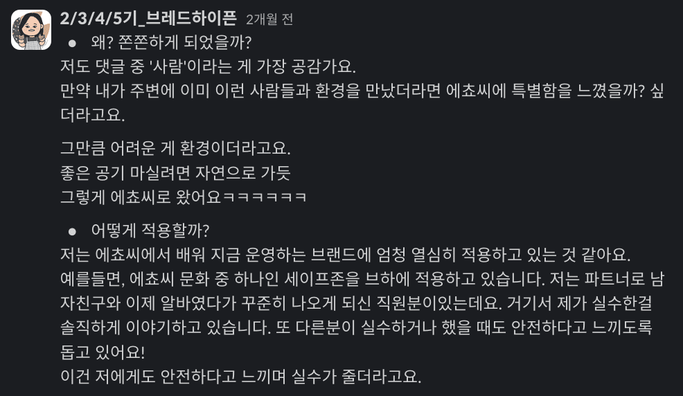 저는 하이아웃풋클럽이 진심으로 진짜로 오래 오래 갔으면 좋겠는데요, 그게 왜그럴까 생각해보면 세상에 이런 사람들이 많지 않더라고요. (내가 유별난 사람or 환경에 적응하지 못하는 사람처럼 느껴지는 순간이 많았어요.) 그런데 여기 오니까 자신의 성장과 발전을 위해 끊임 없이 노력하고 더 나은 삶을 살기위해 혼자가 아닌 같이의 가치를 아는 사람들이 되게되게 많았고, 덕분에 저도 계속 자극 받고 더 나은 사람이 되기 위해 에쵸씨에 머무르고 있는게 아닐까 싶더라고요!