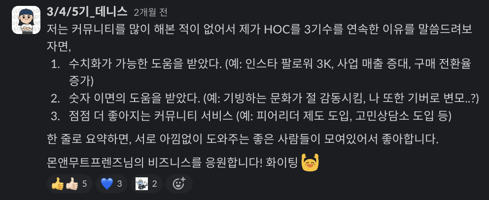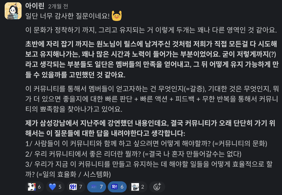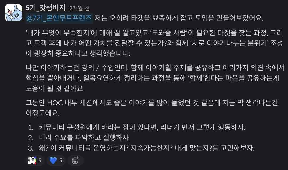 커뮤니티에서 ‘내가 무엇이 부족한지‘에 대해 잘 알고있고 ‘도와줄 사람‘이 필요한 타겟을 찾는 과정, 그리고 모객 후에 내가 어떤 가치를 전달할 수 있는가?와 함께 ‘서로 이야기나누는 분위기’ 조성이 굉장히 중요하다고 생각했습니다. 나만 이야기하는건 강의 / 수업인데, 함께 이야기할 주제를 공유하고 여러가지 의견 속에서 핵심을 뽑아내거나, 일목요연하게 정리하는 과정을 통해 ‘함께’한다는 마음을 공유하는게 도움이 될 것 같아요.