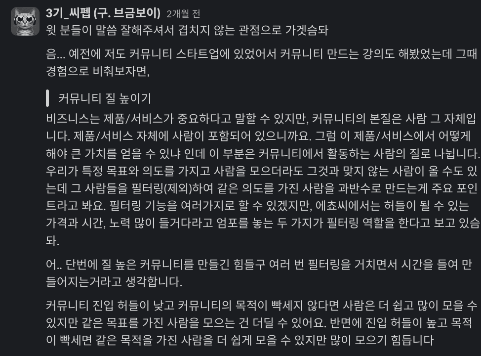 커뮤니티의 본질은 사람 그 자체입니다. 제품/서비스 자체에 사람이 포함되어 있으니까요. 그럼 이 제품/서비스에서 어떻게 해야 큰 가치를 얻을 수 있냐인데 이 부분은 커뮤니티에서 활동하는 사람의 질로 나뉩니다. 우리가 특정 목표와 의도를 가지고 사람을 모으더라도 그것과 맞지 않는 사람이 올 수도 있는데 그 사람들을 필터링(제외)하여 같은 의도를 가진 사람을 과반수로 만드는게 주요 포인트라고 봐요.