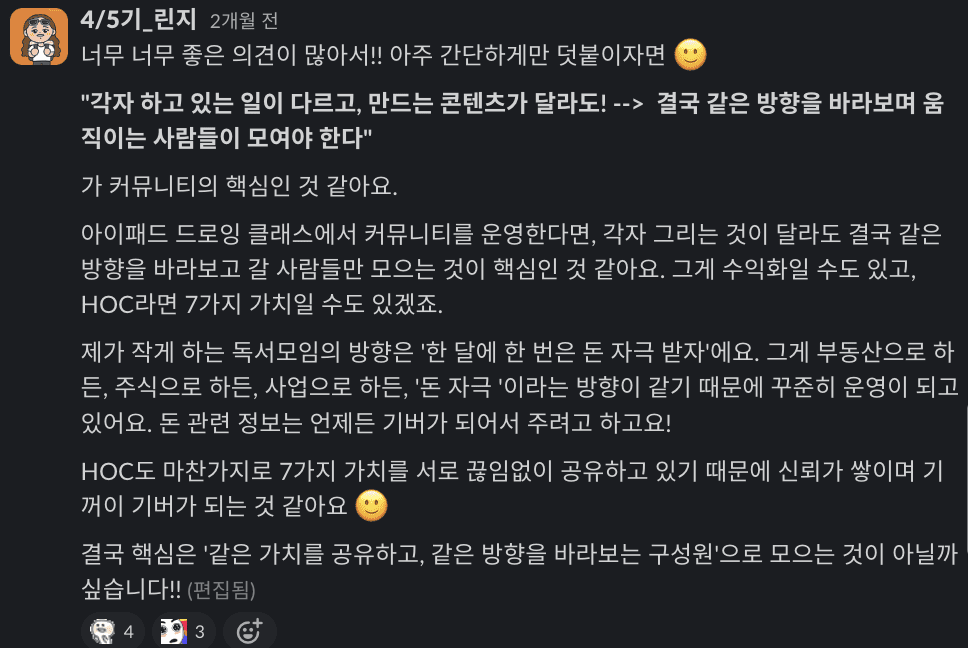 가 커뮤니티의 핵심인 것 같아요. 아이패드 드로잉 클래스에서 커뮤니티를 운영한다면, 각자 그리는 것이 달라도 결국 같은 방향을 바라보고 갈 사람들만 모으는 것이 핵심인 것 같아요. 그게 수익화일 수도 있고, HOC라면 7가지 가치일 수도 있겠죠.