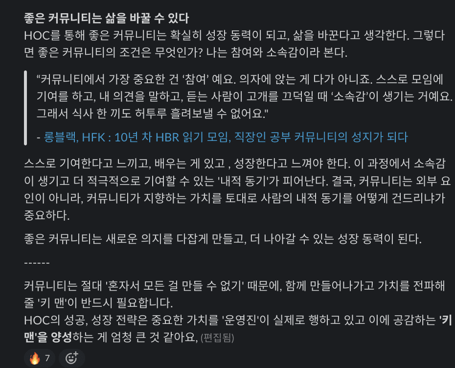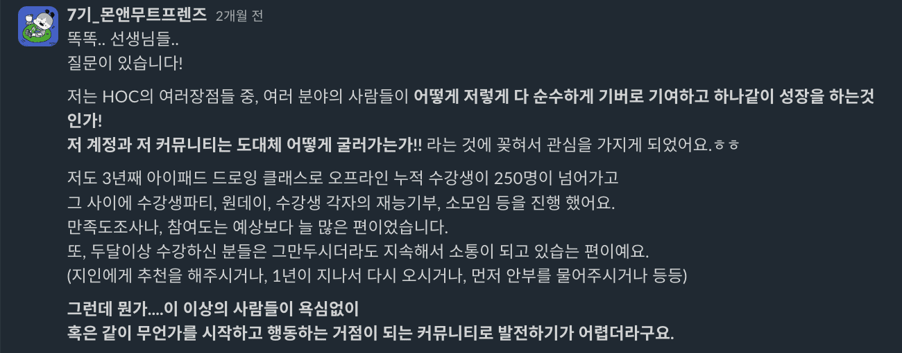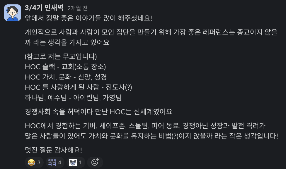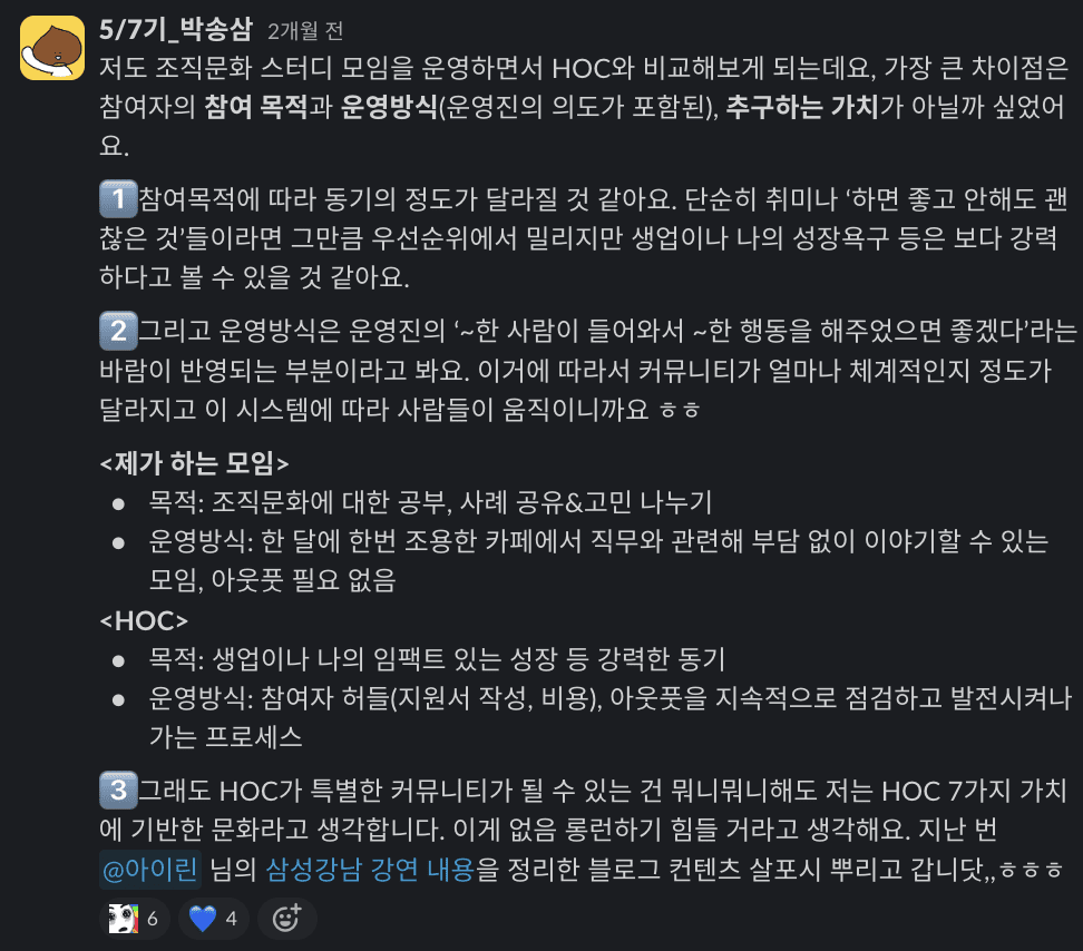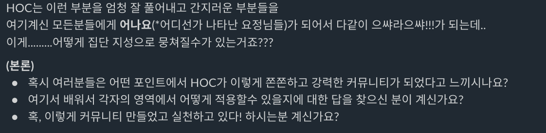 "여러분들은 어떤 포인트에서 HOC가 이렇게 쫀쫀하고 강력한 커뮤니티가 되었다고 느끼시나요?”
