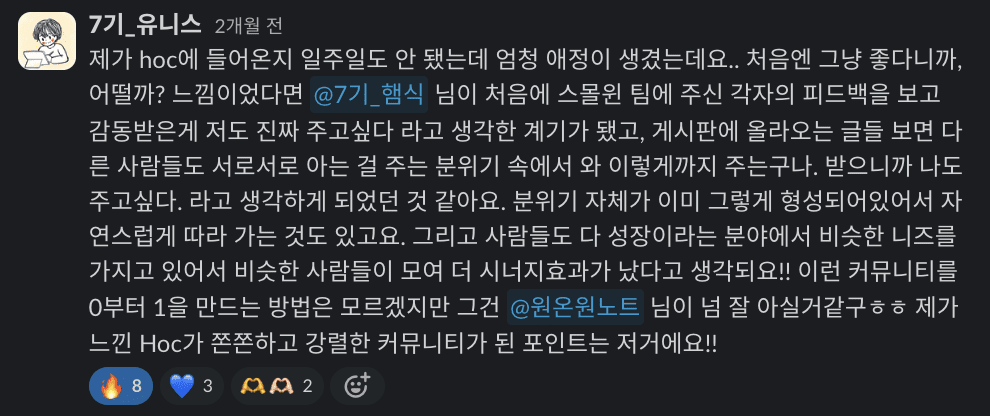 제가 하이아웃풋클럽에 들어온지 일주일도 안 됐는데 엄청 애정이 생겼는데요. 처음엔 그냥 좋다니까, 어떨까? 느낌이었다면 7기 햄식님이 처음에 스몰윈 팀에 주신 각자의 피드백을 보고 감동받은게 저도 진짜 주고싶다 라고 생각한 계기가 됐고, 게시판에 올라오는 글들 보면 다른 사람들도 서로서로 아는 걸 주는 분위기 속에서 와 이렇게까지 주는구나. 받으니까 나도 주고싶다. 라고 생각하게 되었던 것 같아요. 분위기 자체가 이미 그렇게 형성되어있어서 자연스럽게 따라 가는 것도 있고요. 그리고 사람들도 다 성장이라는 분야에서 비슷한 니즈를 가지고 있어서 비슷한 사람들이 모여 더 시너지효과가 났다고 생각되어요.