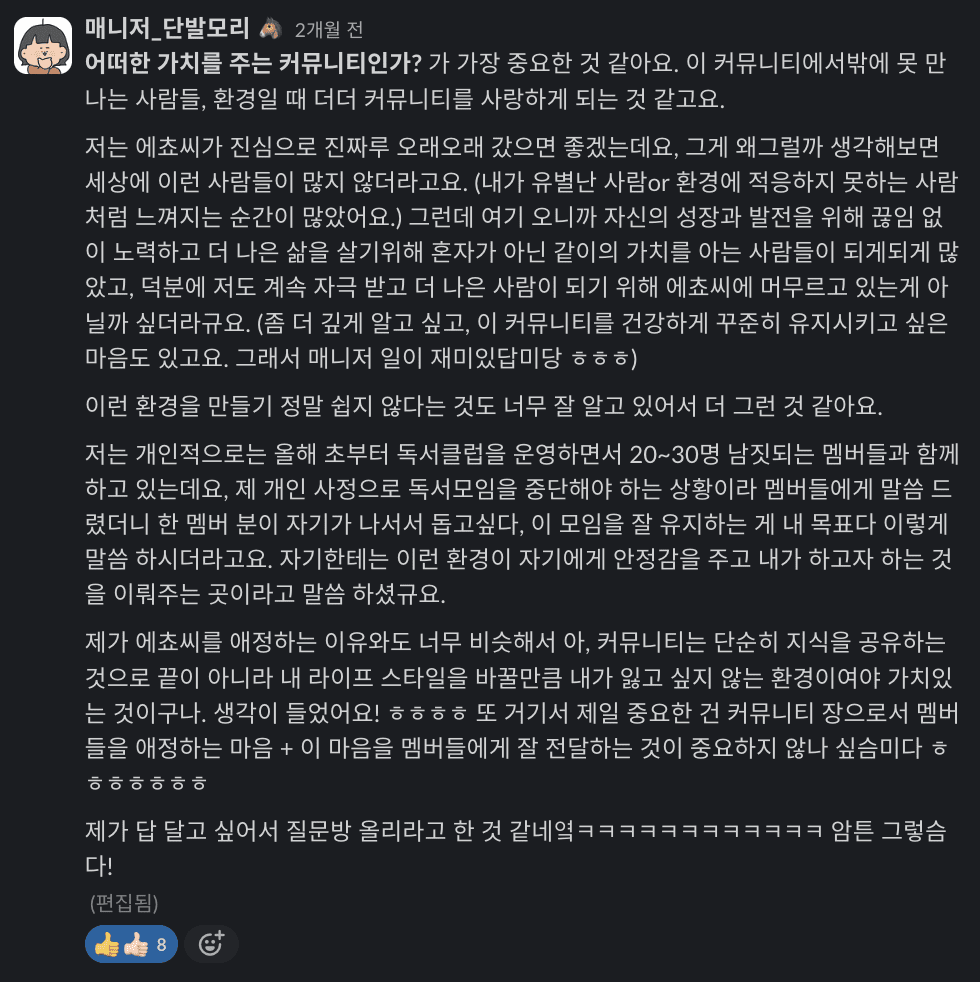 결국 커뮤니티가 오래 단단히 가기 위해서는 이 질문들에 대한 답을 내려야한다고 생각합니다.