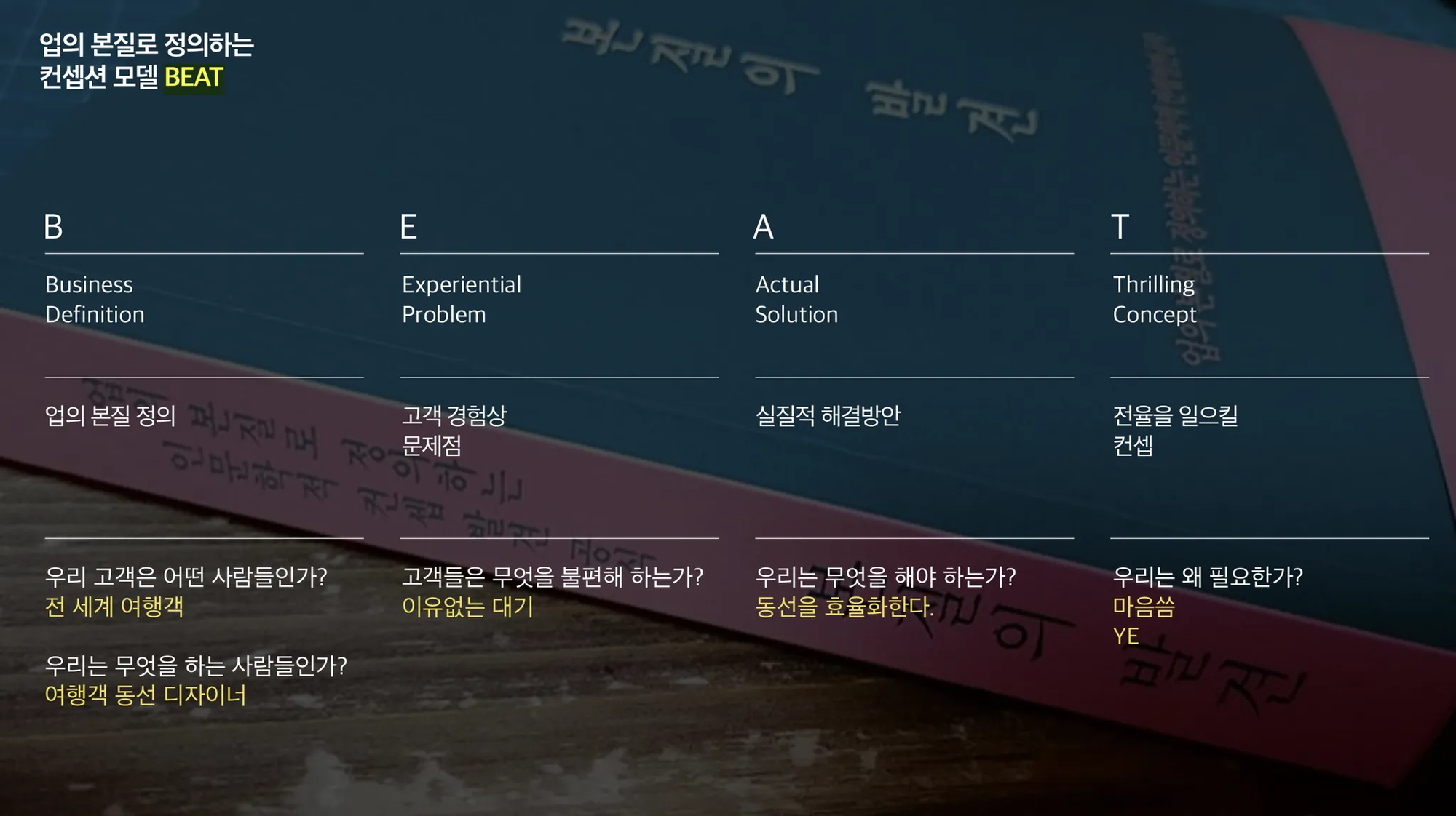 B.E.A.T(Business, Experience, Actual Solution, Thrilling Concept)라는 프레임워크처럼, 업의 본질을 다시 묻고 고객 경험의 구조를 설계하는 접근이 필요합니다.