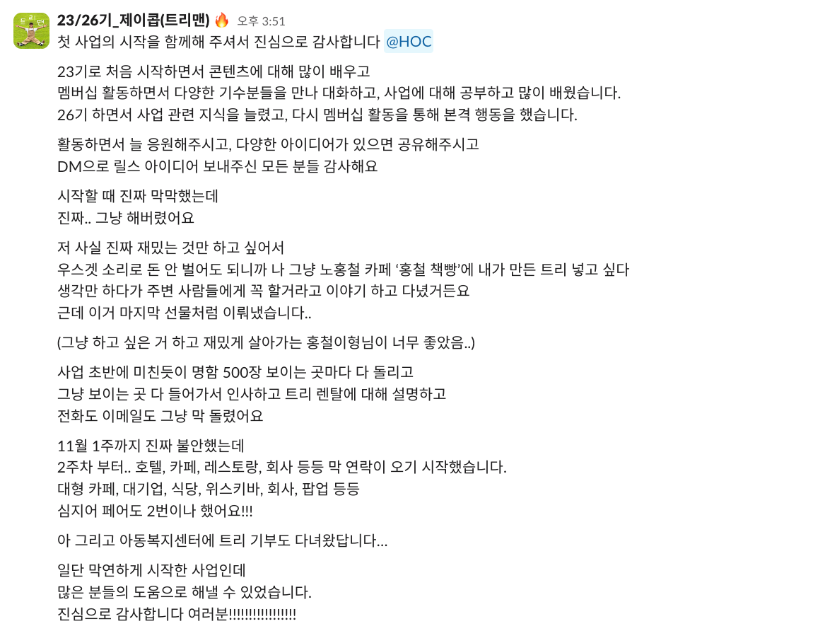 - 고민보다는 실행을 중요시하며, HOC 내부의 인적 자원을 적극 활용하라는 조언이다.