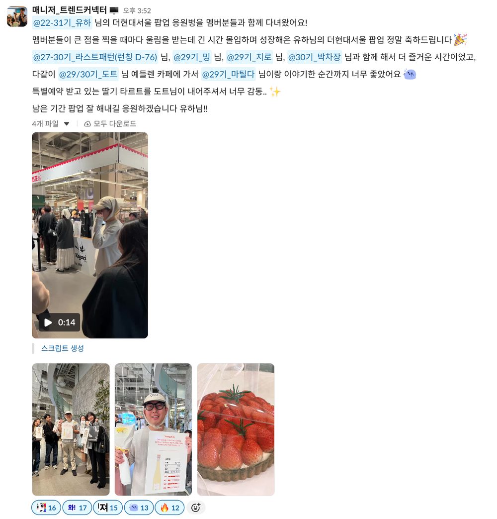 - 28기:반얀트리 팝업 & 현대백화점 팝업 진행 & 하이아웃풋클럽 멤버 드리밍코치님과의 협업으로 감탄주 서포터즈 모집