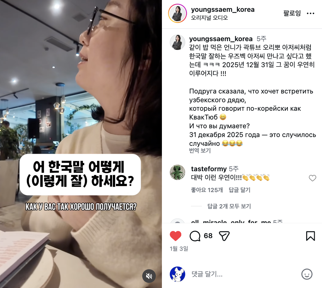 실제 결과: 한국인이 러시아어를 쓰며 한국어를 쓰는 러시아어 화자와 대화하는 모습 자체가 귀엽고 긍정적으로 인식되면서, 예상과 다른 포인트에서 반응이 폭발.