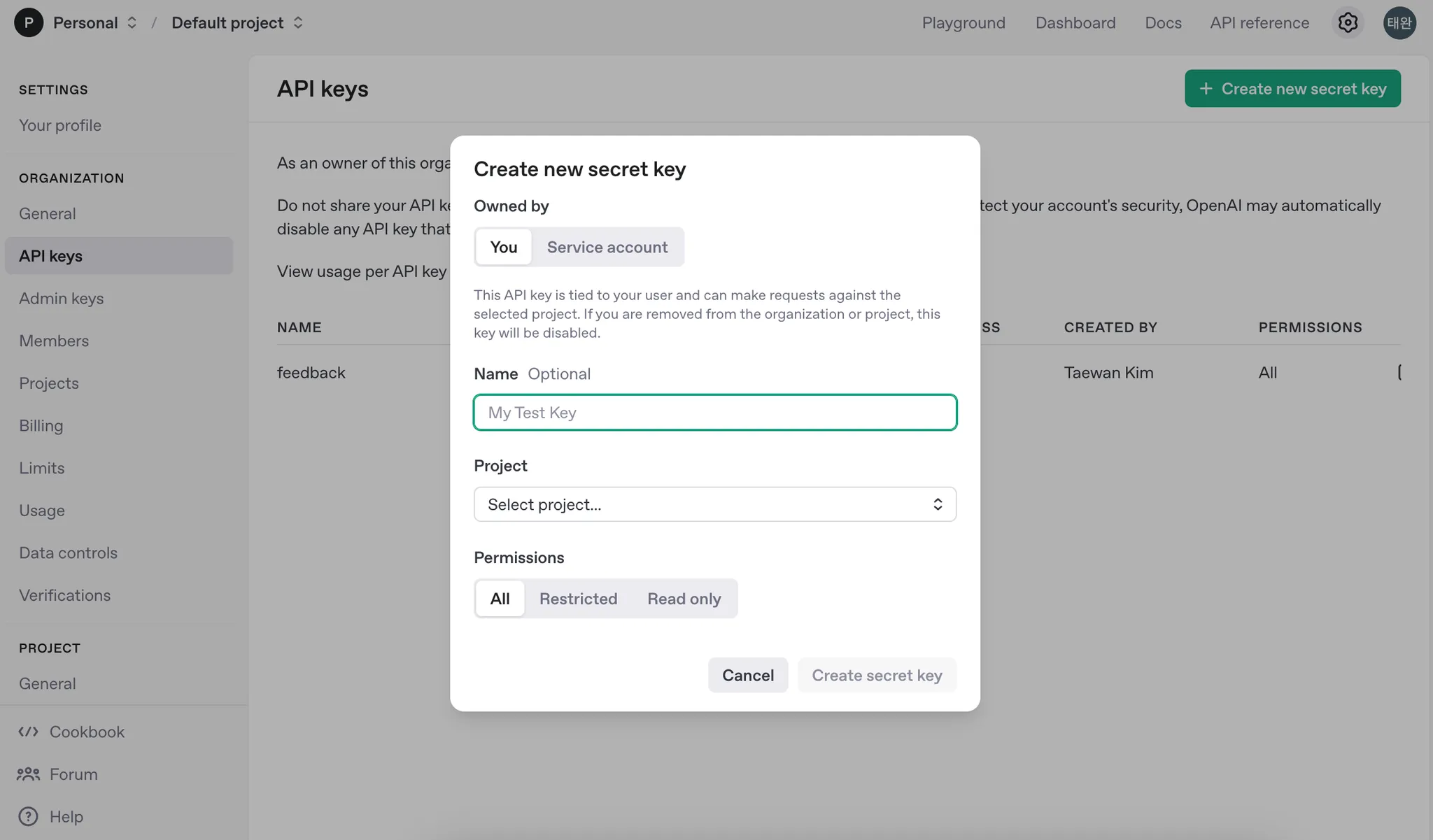 Name과 프로젝트를 설정하면 아래와 같이 API Key가 생성됩니다.