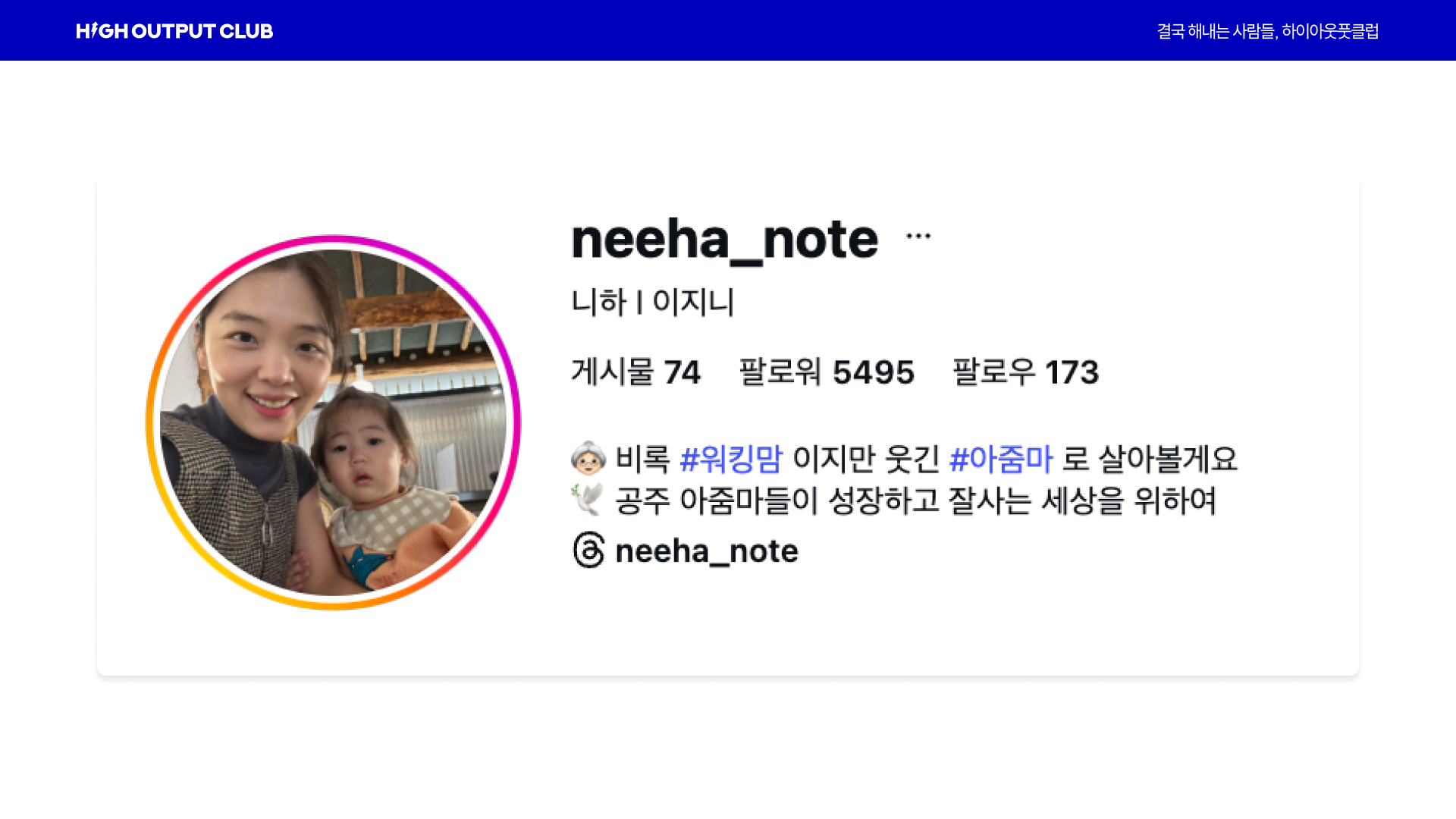 니하님의 계정은 "비록 워킹맘이지만 웃긴 아줌마로 살아볼게요"라는 첫 줄에서 페르소나가 한 번에 잡힙니다.