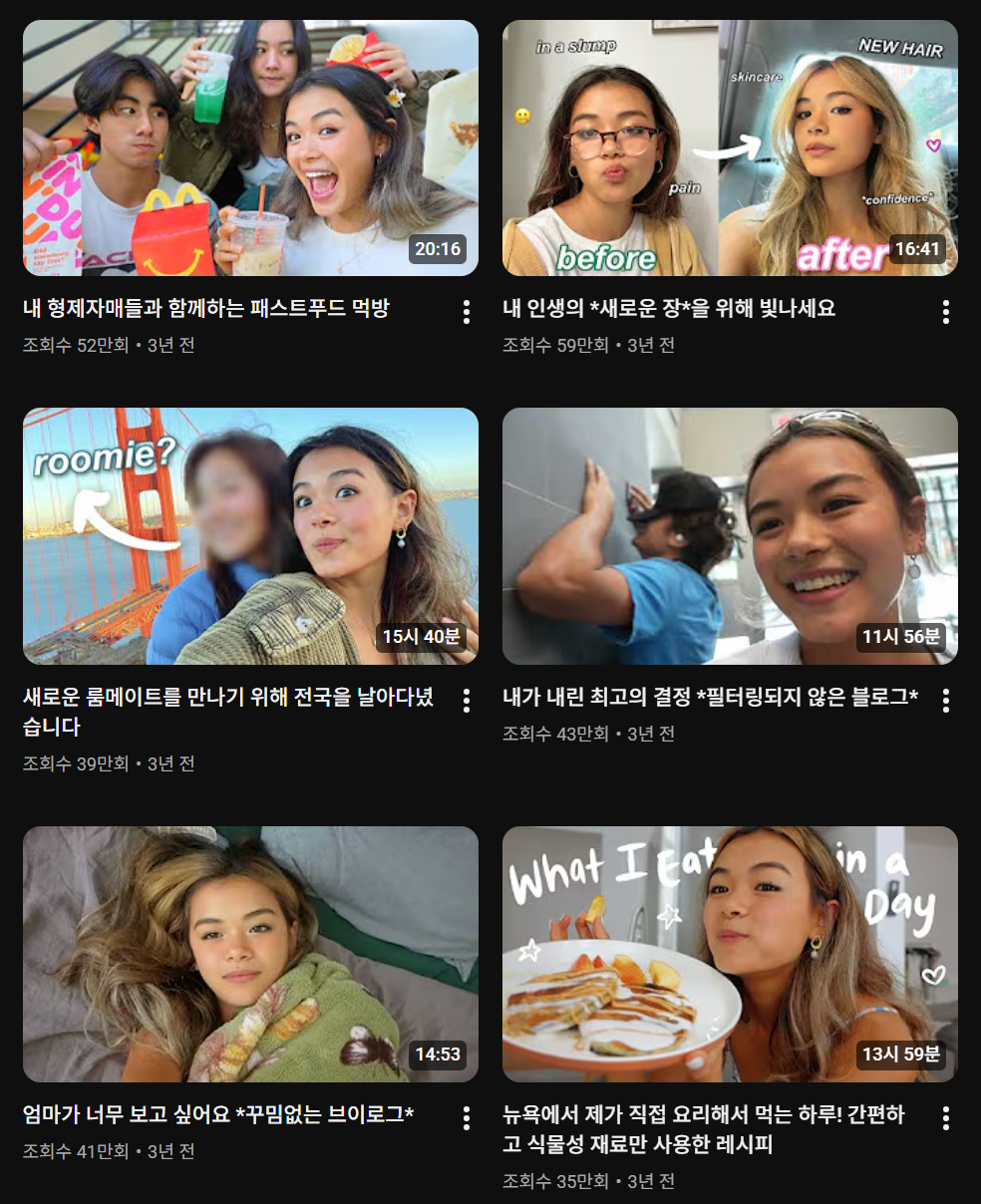 - 고등학생·대학생 시절의 성장 과정(브이로그, 하울, 리뷰 등)